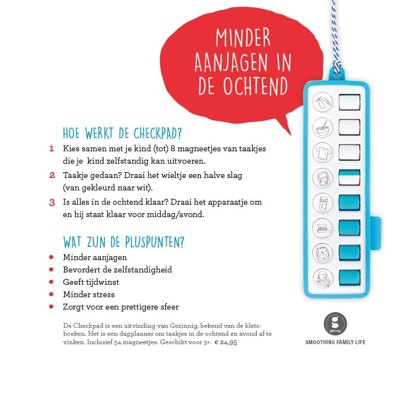 Al aangekleed? Check! Je tanden gepoetst? Check! Je gymtas ingepakt en je haren gekamd? Check! De Checkpad is een hulpmiddel voor kind en ouder om de ochtend- en avondroutines te versoepelen. Vanaf nu hoeven ouders niet meer 100 keer te roepen wat er allemaal nog moet gebeuren. De Checkpad laat zien wat er van een kind wordt verwacht. Dat scheelt tijd en stress.