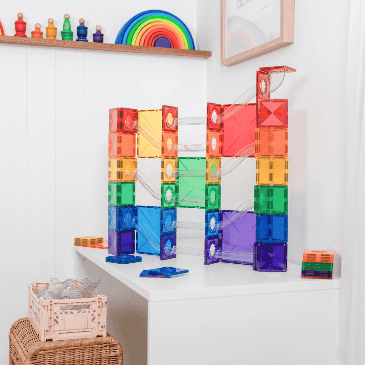 Dit pakket biedt kinderen spannende mogelijkheden om hun fantasie te ontdekken en spelenderwijs te leren! Het 134-delige Super Ballenbaan Pakket bevat alles wat je nodig hebt om uitgebreide ballenbanen te bouwen. Het bevat 42 grote en kleine vierkante magnetische tegels ter ondersteuning van grote bouwwerken, een reeks exclusief ontworpen transparante gecanneleerde buizen met geluidstrappen, S-bochten en een splitbuis voor raceplezier, kleurrijke verbindingstegels en 6 houten ballen in regenboogkleuren!