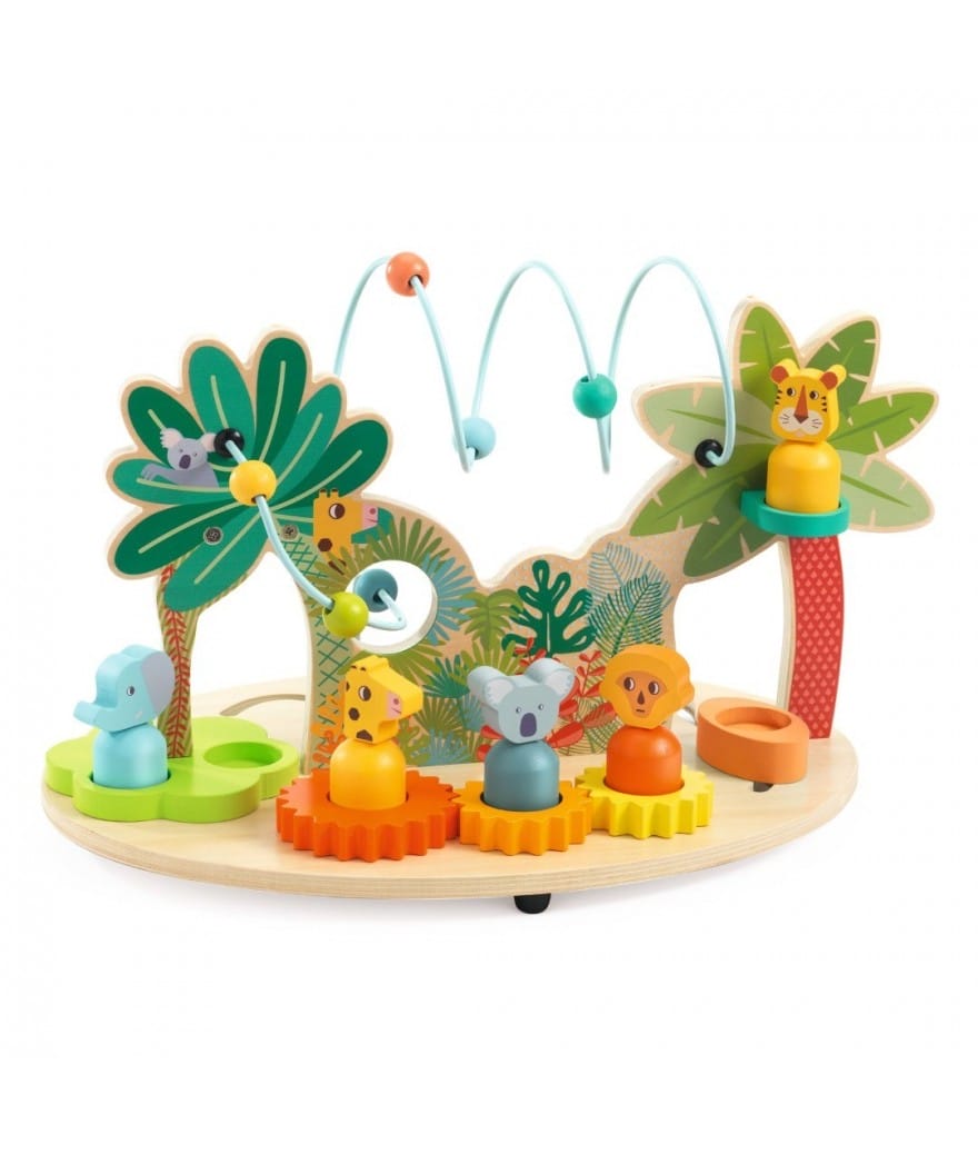 Multi Big is een grote activiteitentafel om te spelen met dieren uit de jungle. Volop speelplezier met deze tafel met 8 activiteiten: De dieren klimmen in het bootje dat door het kind geduwd wordt op het circuit door de junglemuur. Ze draaien en dansen op de 3 tandwielen en maken een rondedansje op het wiel rond de klimplanten. Ze geven elkaar de knikkers door van de ene naar de andere kant van de jungle en laten ze op het tweede circuit verdwijnen. Ze gaan op de 2 stokken zitten en openen de deur om er onder te gaan staan en laten de kokosnoten draaien om geluid te maken.