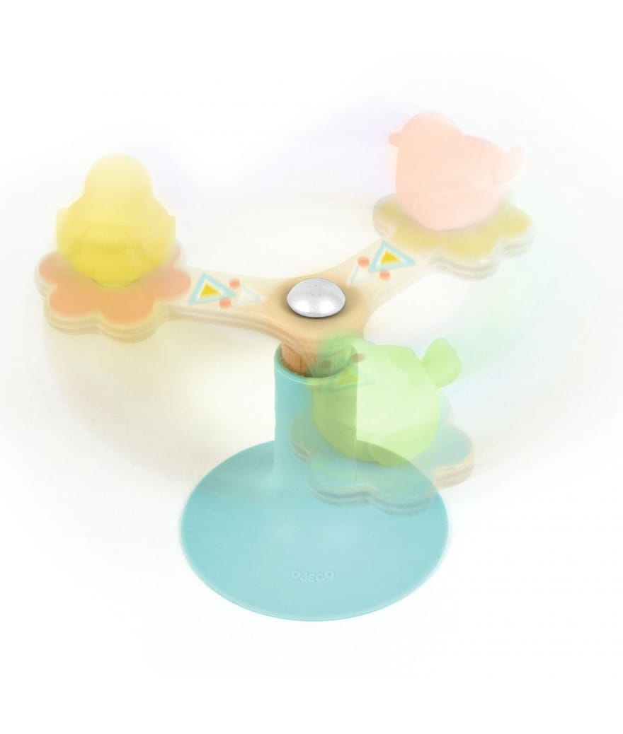 BabySpini is draaiend babyspeelgoed op een zuignap van natuurlijk hout en pastelkleuren, voor kinderen vanaf 12 maanden. Het kind geeft een impuls met zijn hand en laat de 3 vogels snel en langdurig rond hun as draaien. Fascinerend om te zien!