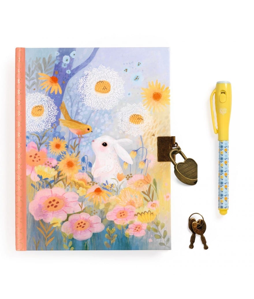 Een notitieboekje met een stift met onzichtbare inkt om al je geheimen in op te schrijven en om in te tekenen! Ga er met een UV-lamp overheen en alle geheimen worden onthuld. Dit notitieboekje bestaat uit 88 pagina’s met lijntjes, die allemaal geïllustreerd zijn met kleine tekeningen. Het heeft een hartvormig slotje en twee sleutels om al je verhalen te beschermen tegen nieuwsgierige blikken.