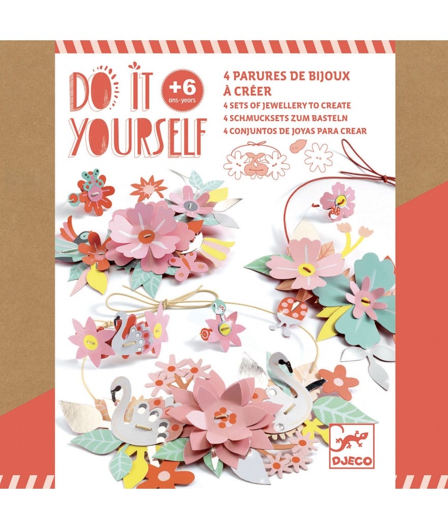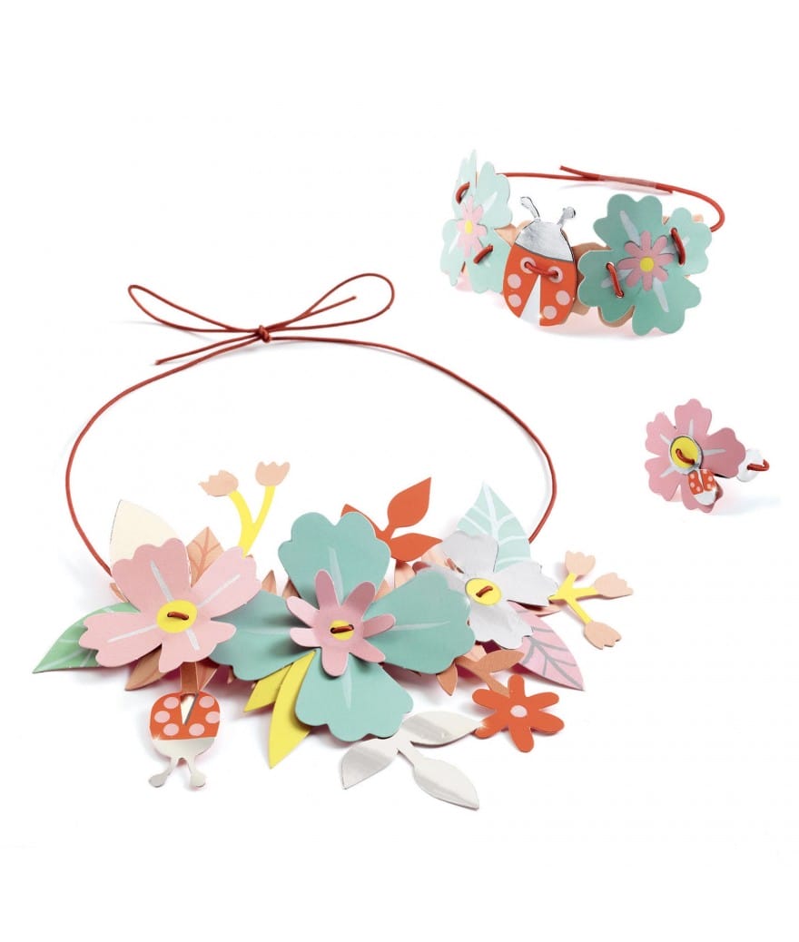 Een creatieve kit om vier sets papieren juwelen te maken, in een frisse bloemensfeer. Elke set bestaat uit een bijpassende ring, armband en halsketting. Een eenvoudige activiteit geïnspireerd op de techniek van het rijgen van echte bloemen.