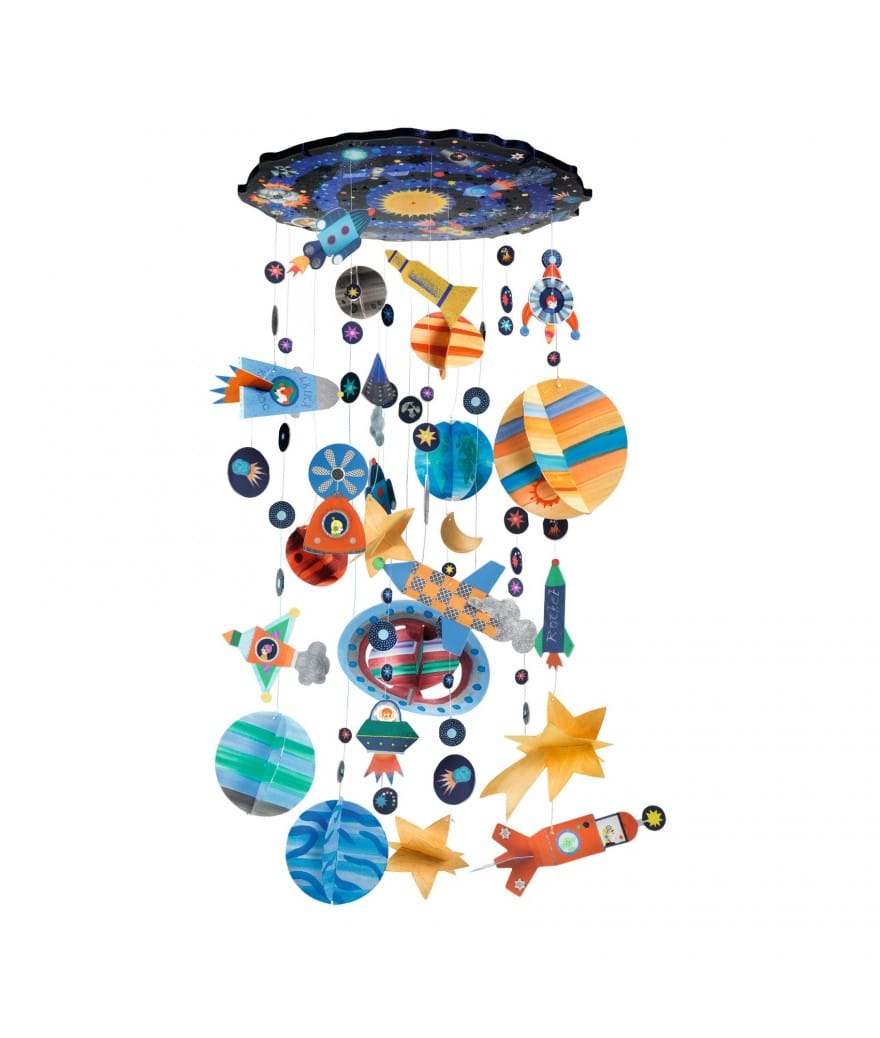 Een creatieve pakket om een grote decoratieve mobiel te maken met als thema het zonnestelsel.