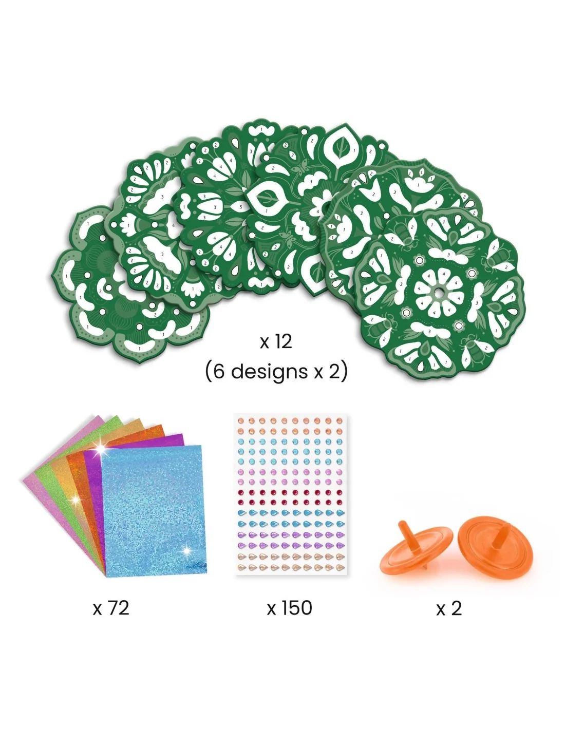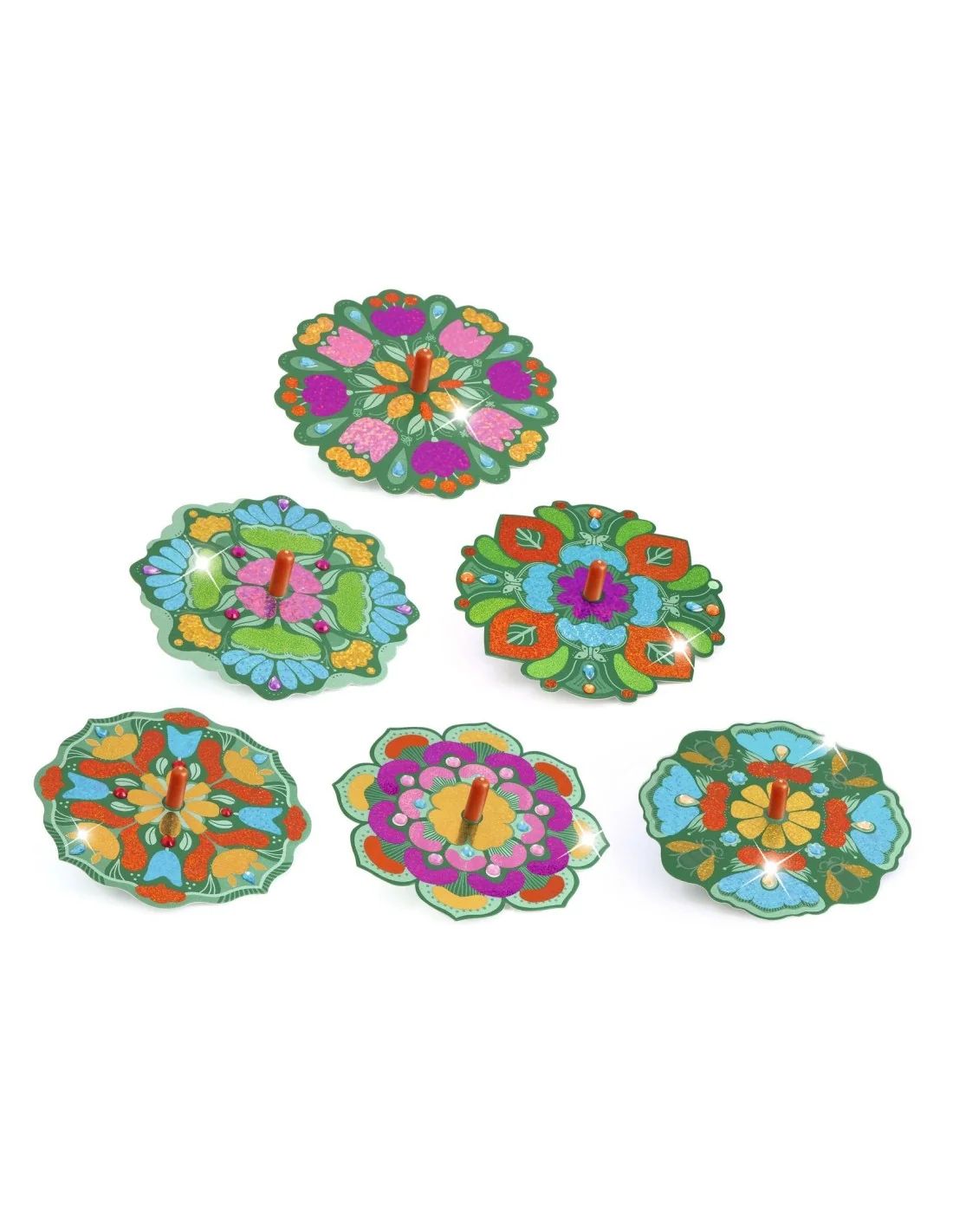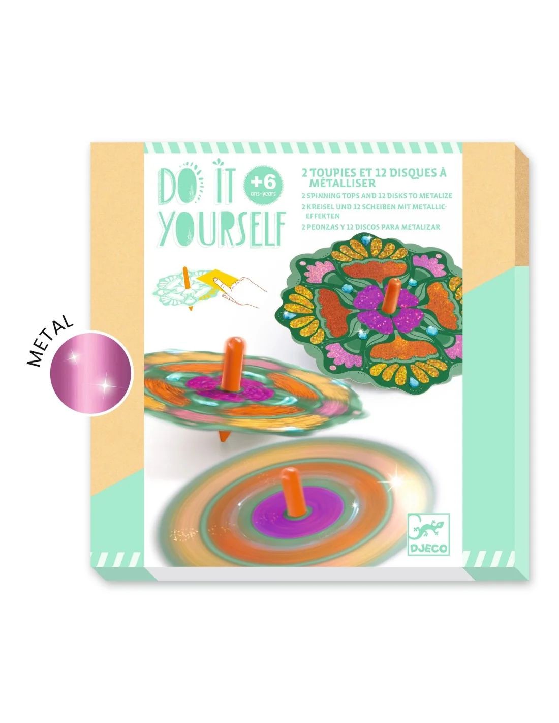 Een creatieve set voor het personaliseren van 12 Flower Power-tollen met prachtige metallic glans. Door de kleurcode op de schijven te volgen, weet het kind waar de metallic glans komt. Hij/zij haalt het gelijmde oppervlak los en legt er dan de metaalfolie op. Het materiaal blijft als bij toverslag kleven! Nu hoeft het kind alleen nog maar zelfklevende strassteentjes aan zijn/haar creaties toe te voegen en de tollen laten draaien om de metallic schitteringen te bewonderen. Het resultaat is hypnotiserend!