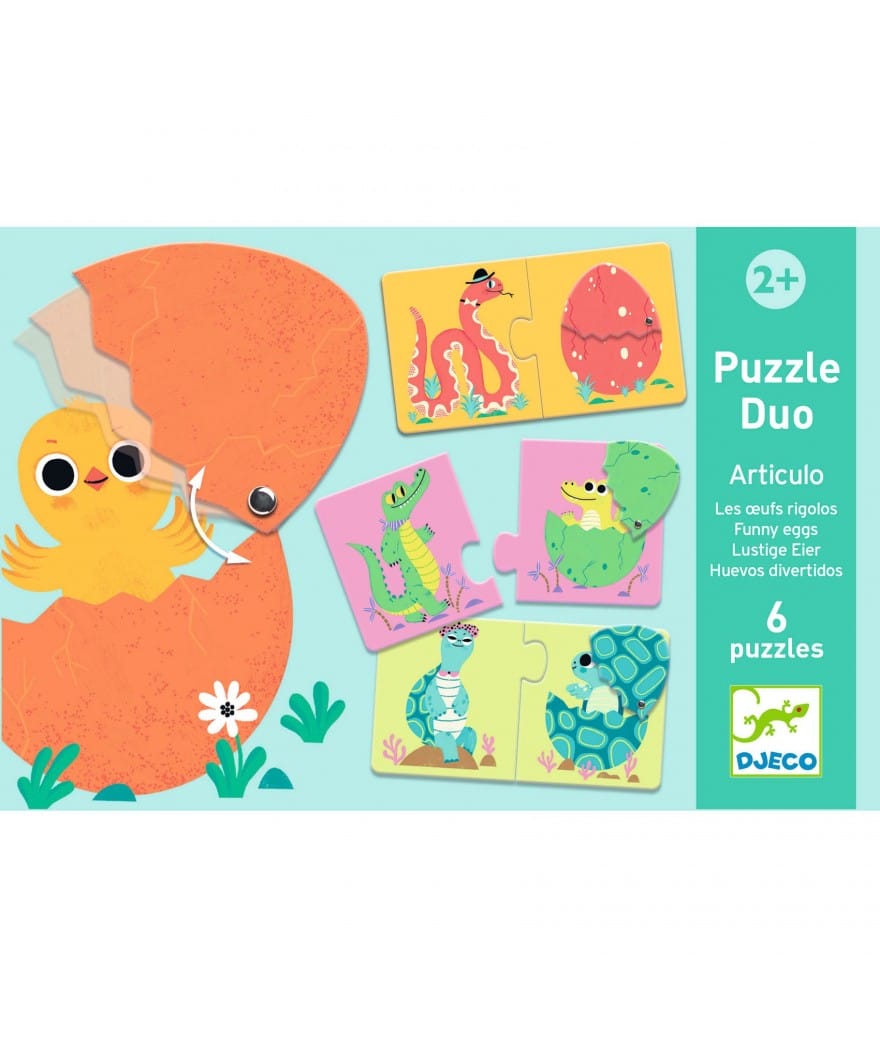 Een educatieve puzzel waarbij het kind het dier combineert met zijn ei en vervolgens ontdekt welke baby erin verstopt zit: verrassing! De eenvoudige en ludieke duo-trio-puzzels zijn spelletjes waarbij ideeën gecombineerd worden, voor kinderen vanaf 2 jaar. In elke doos een combinatie om deze goed te begrijpen en te beheersen. De dikke stukken kunnen door de kinderhandjes gemakkelijk vast gepakt worden en de opbergdozen kunnen overal mee naartoe!