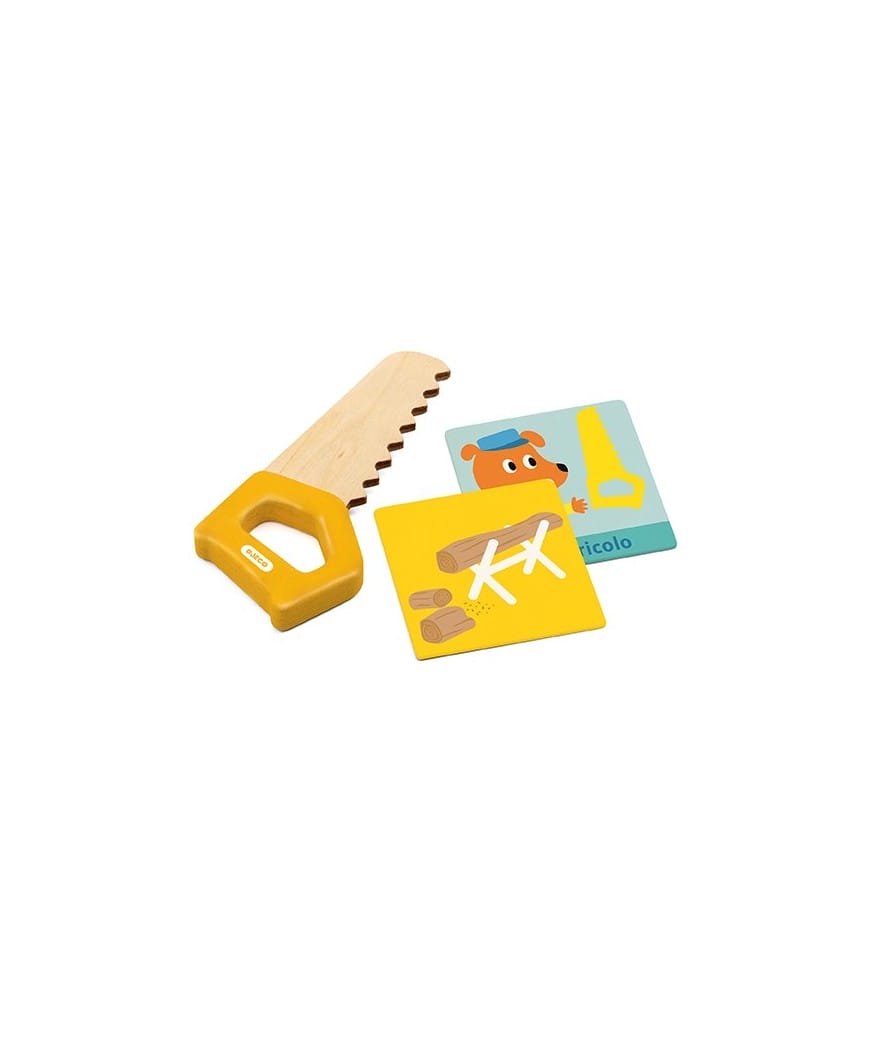 Een houten gereedschapskist met een hamer, zaag, schroevendraaier, boor, tang en acht kaarten, die je zorgvuldig opbergt en ordent. De kaarten combineren een situatie met het juiste gereedschap dat door Super Bricolo moet gebruiken om de reparatie uit te voeren. Een zeer leerzame imitatie set.
