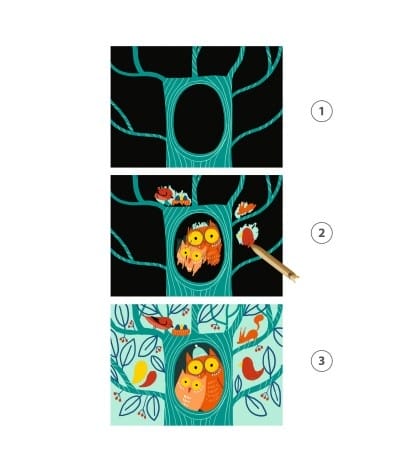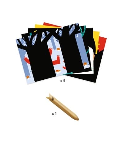 Kleintjes hebben ruimte nodig. Daarom 5 grote krasschilderijen met het thema dieren en een houten stokje dat geschikt is voor peuters vanaf 18 maanden. Met beide kanten van het stokje krast het kind over het oppervlak van de kaart om sporen te maken en verrassingen te ontdekken, wat een pret! En zelfs als het kind in zijn/haar enthousiasme alles wil bekrassen, is het resultaat ook mooi.