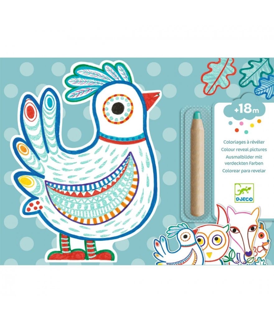 Een mapje met 12 afbeeldingen om in te kleuren met een dik kleurpotlood, geschikt voor kleine kinderhandjes. Het kind kleurt de bosdieren in met het potlood en ontdekt wat er verborgen zit. Het lijkt wel magie: het potlood markeert alleen bepaalde zones, waardoor motieven en andere verrassingen verschijnen!