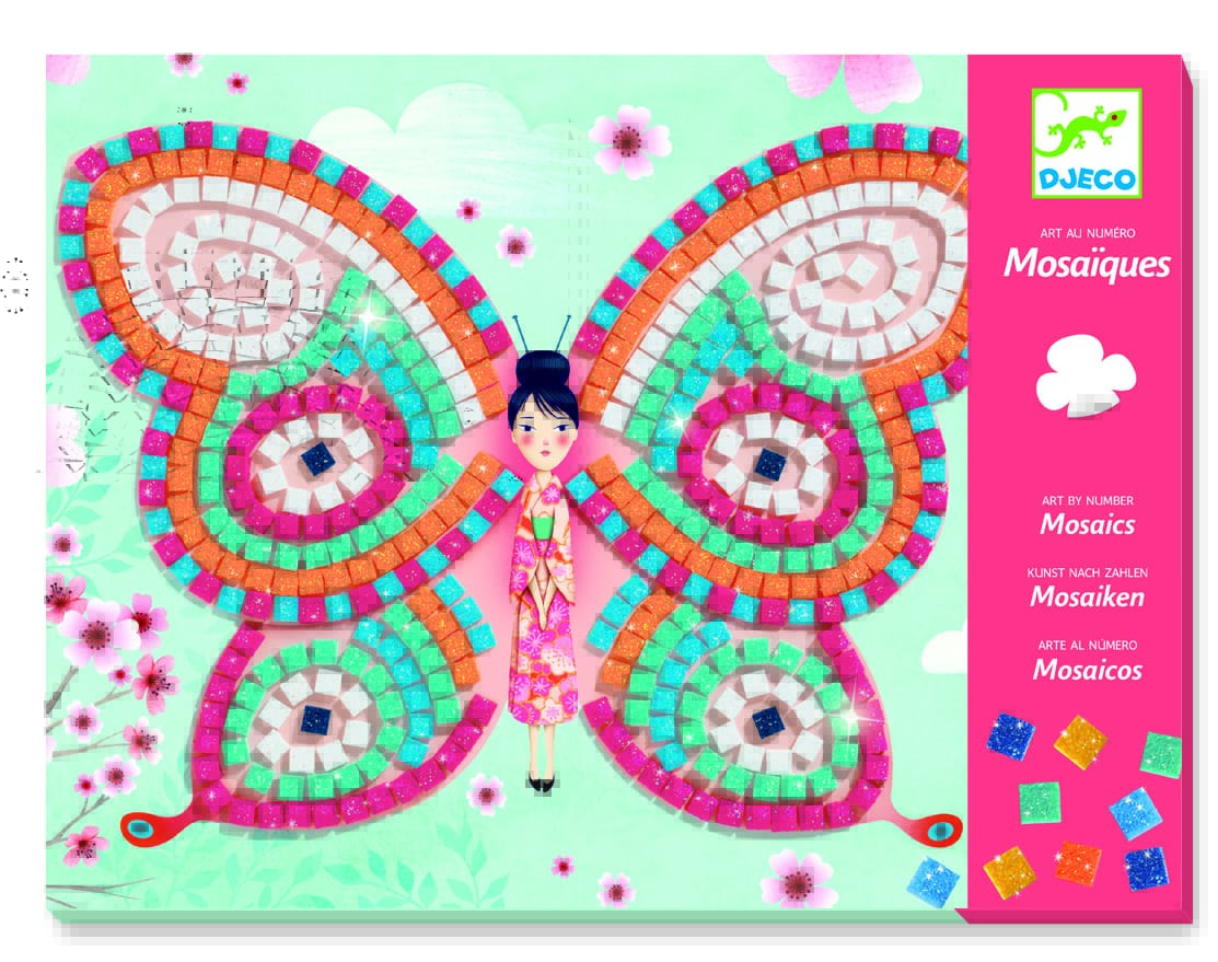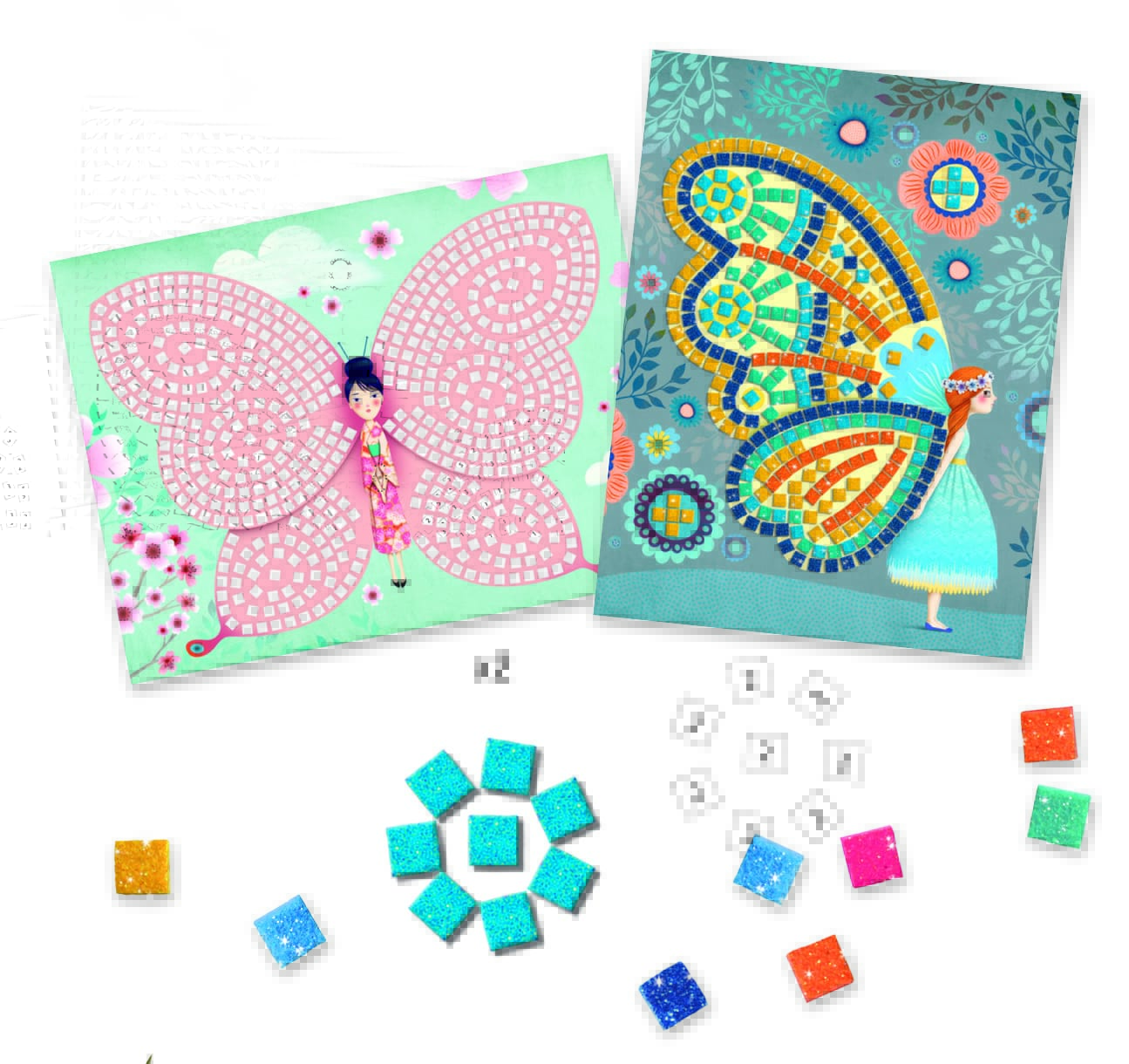 Kunst met een nummer. Twee mozaieken van verschillende vlinders die met stukjes zelfklevend schuim worden gemaakt.