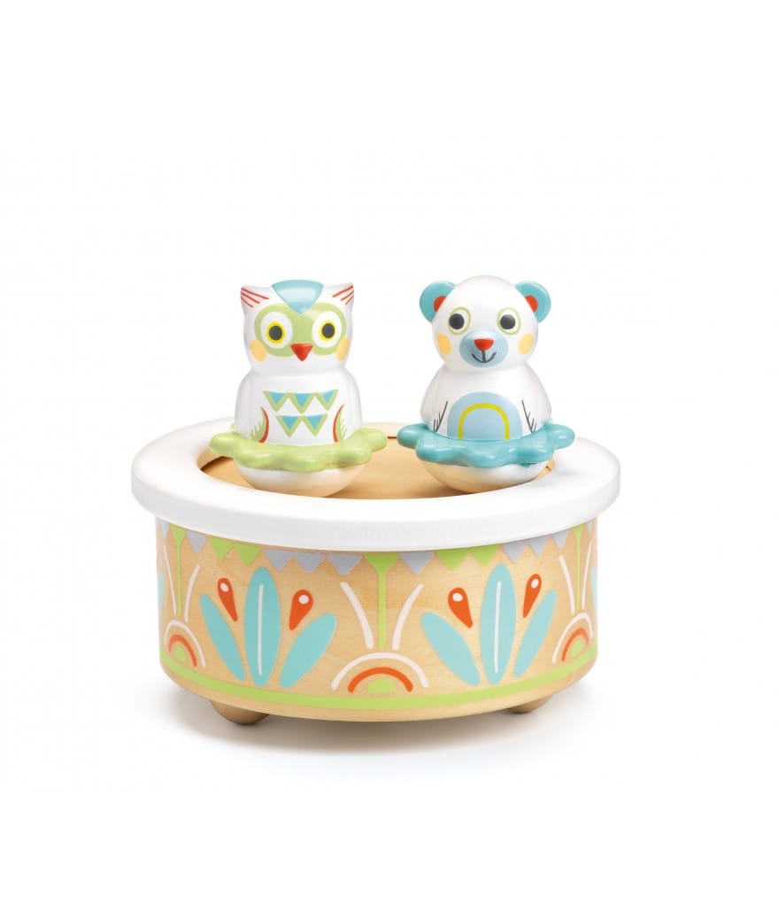Een muziekdoosje van natuurlijk hout en pastelkleuren. Draai de sleutel om en alles komt tot leven! Je baby wordt in slaap gesust door de zachte melodie en kijkt hoe de twee rammelaars, beer en uil, dansen op de muziek.