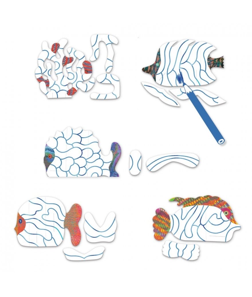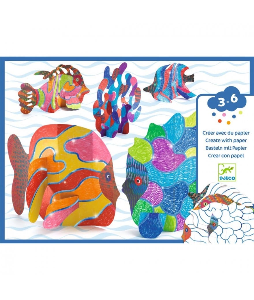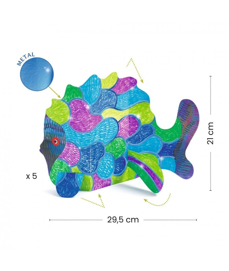 Een kleuractiviteit om een prachtige onderwaterwereld te maken met metallic glans! Het kind kleur eerst in, vouwt en brengt de onderdelen samen. Een onderwaterwereld verschijnt en gaat stralen dankzij de metallic glans.