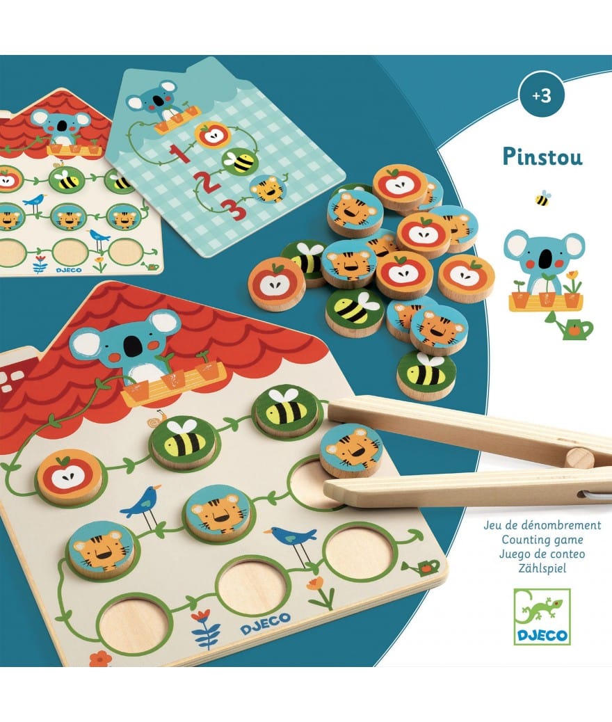 Pinstout is een spel van aftellen en goede motoriek. De kaartjes geven de instructies en het kind plaatst het juiste aantal onderdelen met de klem op het bord. Op de achterkant van de kaarten staat de oplossing in beeld!