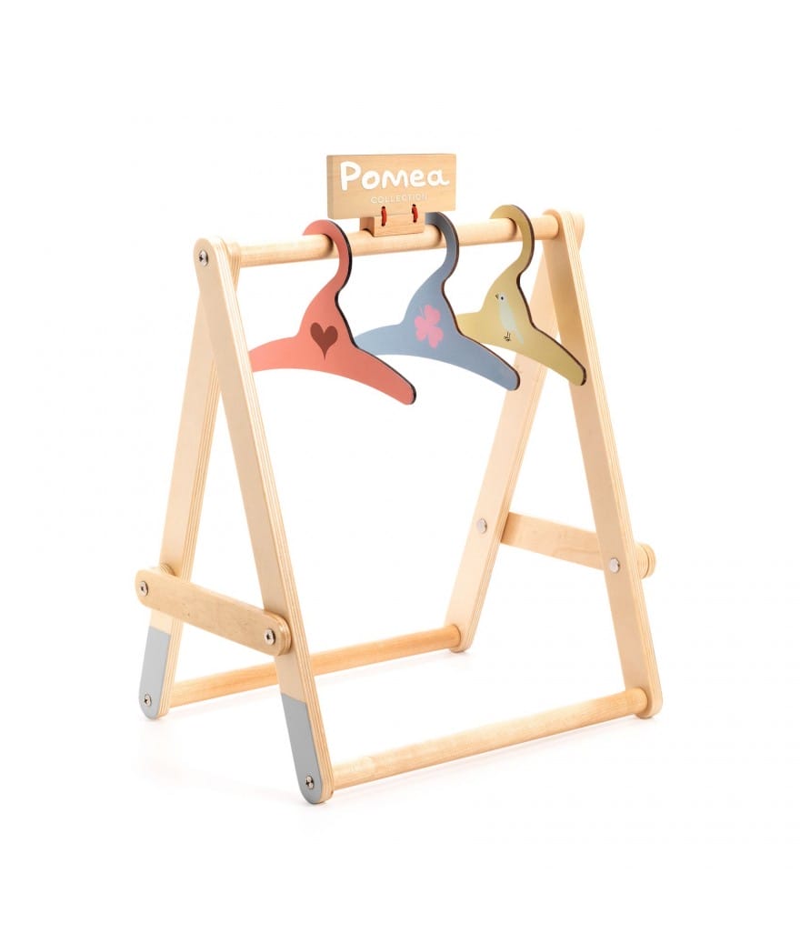 Een houten POMEA-kledingrekje om de poppenkleertjes op drie kleerhangers te hangen. Ideaal in je poppenhoekje.