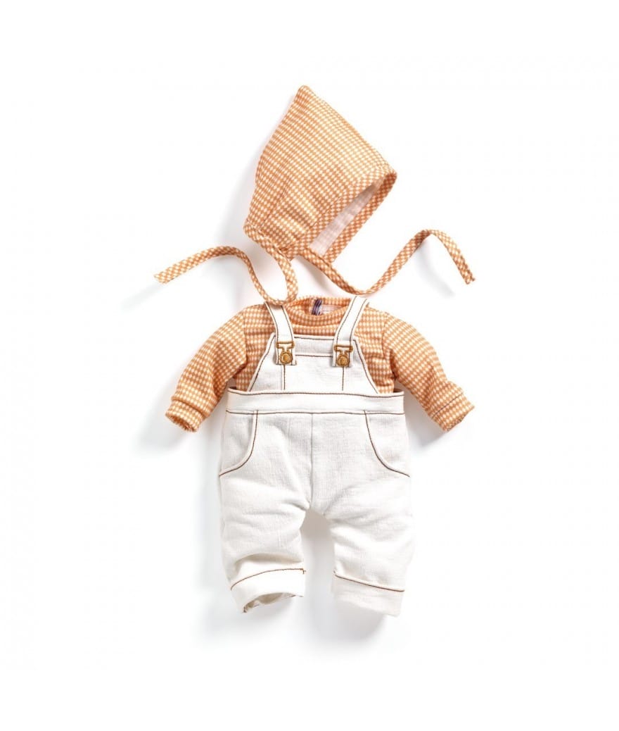Een zowel sjieke als casual outfit van dubbel gaas van 100% katoen. Een wijde tuinbroek die met verborgen klittenband dicht gemaakt wordt, waardoor het kind de pop eenvoudig kan aan- en uitkleden. Het strikmutsje maakt deze outfit helemaal af.
