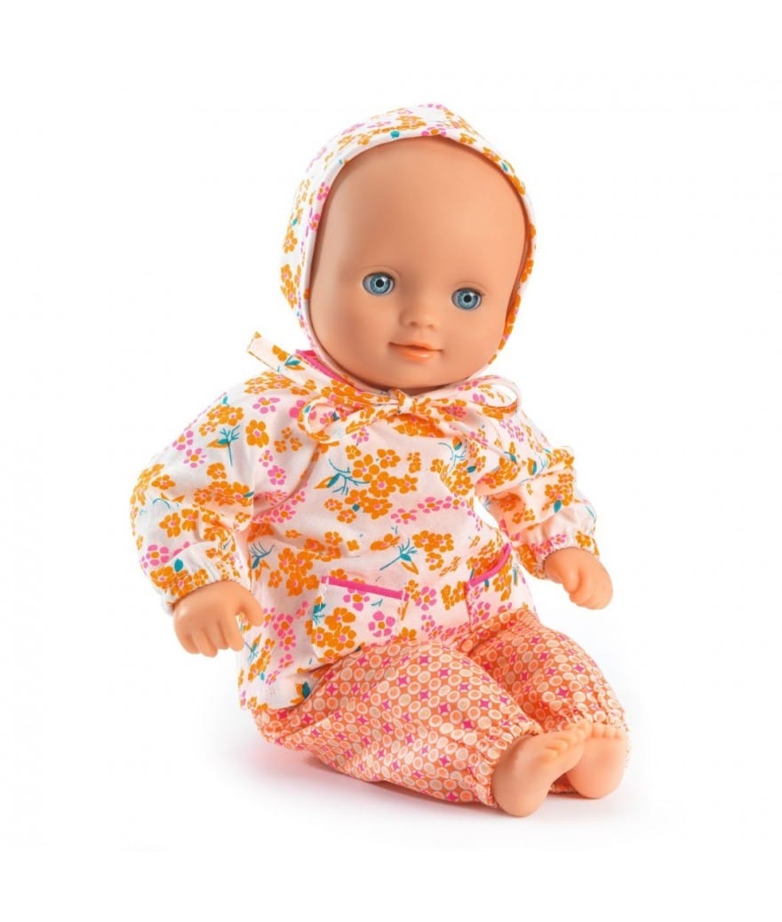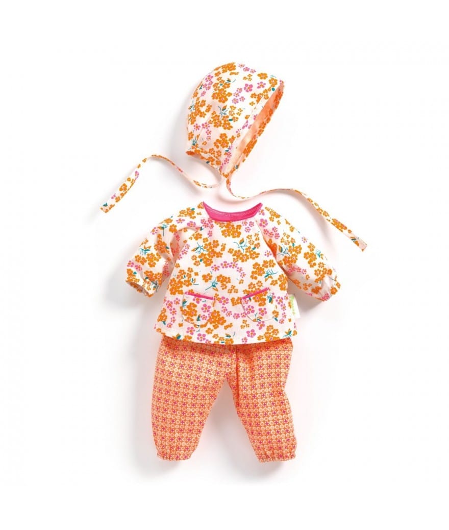 Een set van 3 lichte kledingstukken met gekleurd bloemetjesmotief, perfect voor een zomerse wandeling. Een broekje met een elastische tailleband en een tuniek met bloemetjesmotief met klittenbandsluiting op de rug, waardoor het kind de pop eenvoudig kan aan- en uitkleden. Het strikmutsje maakt deze outfit helemaal af en beschermt de baby tegen de zon.