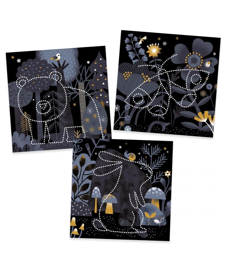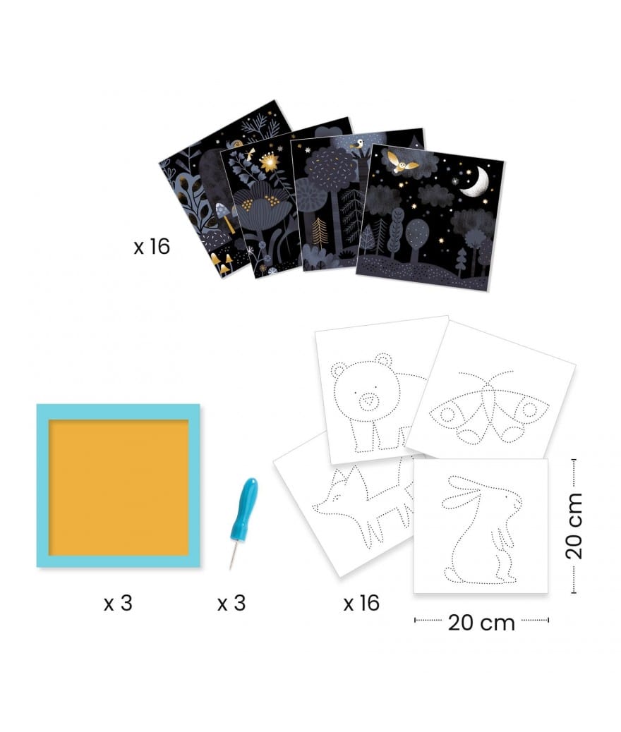 Vier prikkaarten met een vos, vlinder, beer en konijn met een prikmat en prikker en kaarten met achtergronden. Prik de diertjes uit en houdt ze voor het licht.