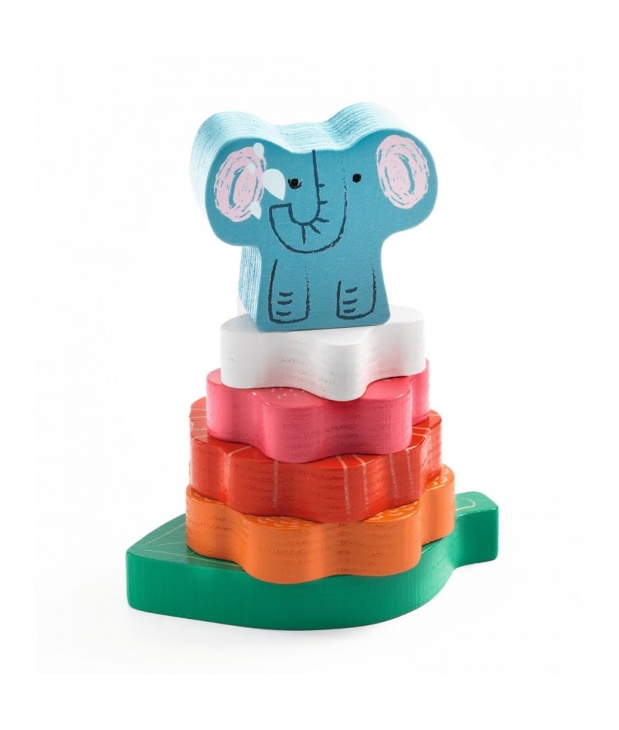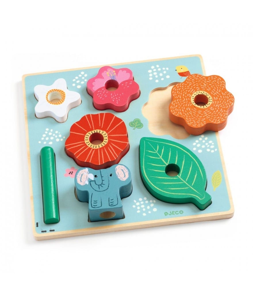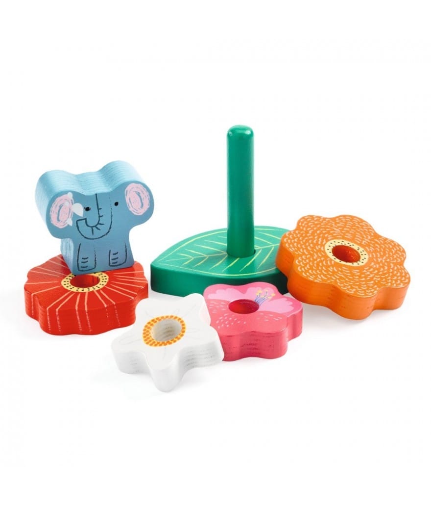 Puzz & Stack is een eenvoudige houten puzzel en een stapelspel. De bloemen worden op de houten spil gestapeld om een mooie bloemenpiramide te vormen met op de punt een olifantje.