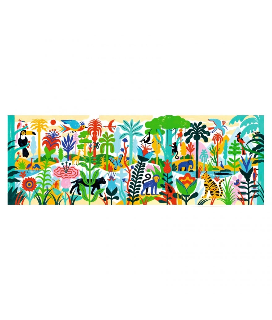Jungle is een gallery-puzzel van 100 gekleurde stukjes met een prachtig gekleurde afbeelding van de flora en fauna van de jungle. We hebben carte blanche aan de illustratoren gegeven voor een nieuw, zeer lang formaat! Een speelse en originele manier om kinderen kennis te laten maken met schilderen.