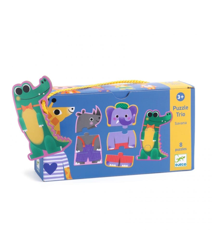 De trio-puzzel Savana is een educatieve dierenpuzzel voor kleine kinderen. Het kind zet de silhouetdieren in elkaar… op verticale wijze.