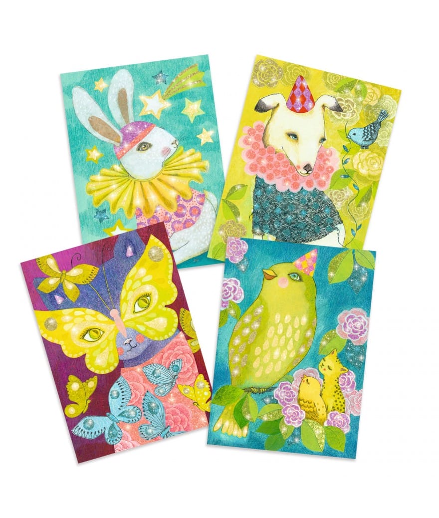 Het knutselpakket Glitter Dierencarnaval van Djeco bestaat uit 4 voorbedrukte kaarten van stevig karton die je nog met glitters moet afmaken. Met het spateltje haal je de laagjes van de plaat waardoor er een lijmlaag ontstaat. Strooi hier de glitters over en je krijgt sparkling schilderijen!