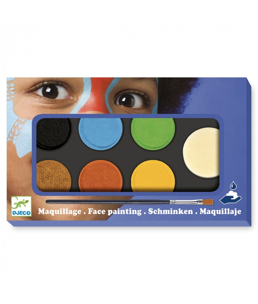 Een schmink palet met 6 dekkende en gemakkelijk te verwerken kleuren: chocolade, oranje, geel, lichtgroen, cyaan, zwart, om naar wens en in alle veiligheid make-up te creëren. Deze set bevat ook een kwastje en een sponsje.