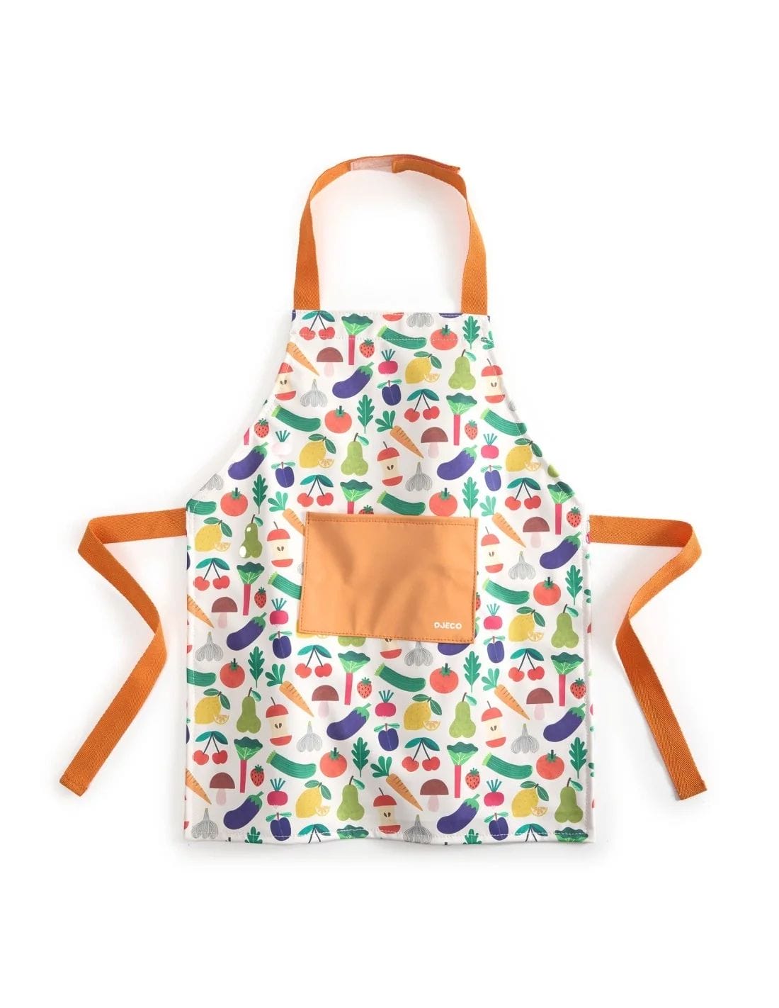 Een schort om lekker samen met volwassenen te koken zonder vies te worden. Eén maat, met een verstelbare neksluiting dankzij klittenband en een taille die kan worden versteld met linten om dicht te knopen.