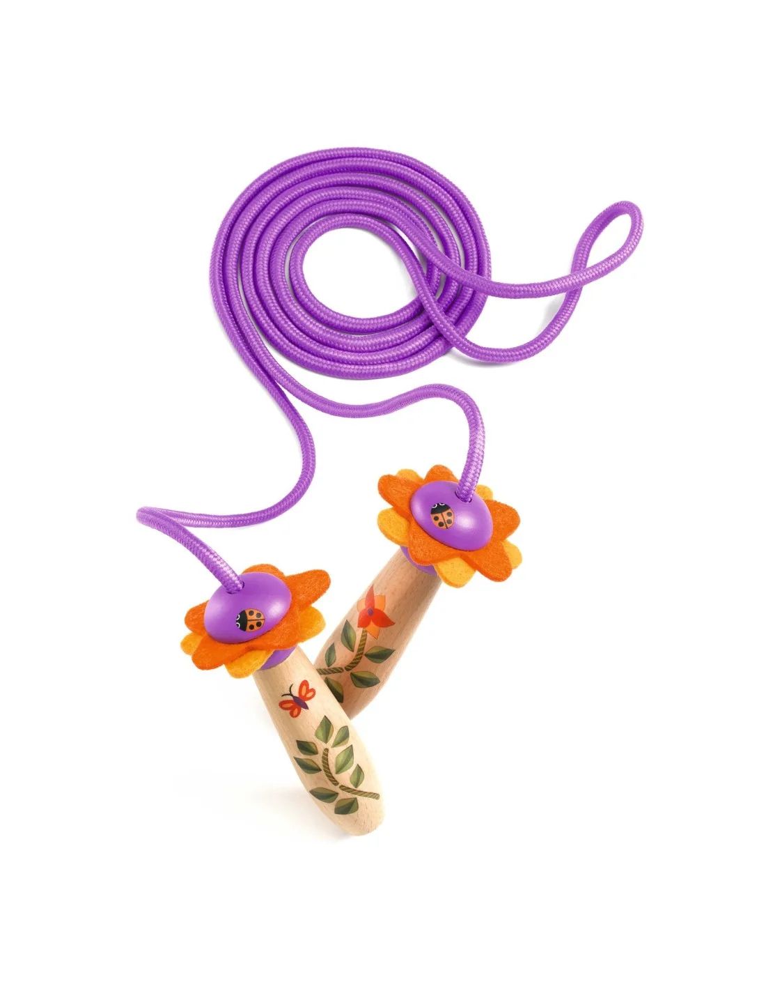 Florita is een FSC-gecertificeerd houten springtouw met prachtig versierde handvatten in de vorm van bloemen. Zeer praktisch, want de lengte van het touw kan worden aangepast aan de grootte van het kind door de bloem los te schroeven en de hoogte van de knopen op het touw aan te passen.