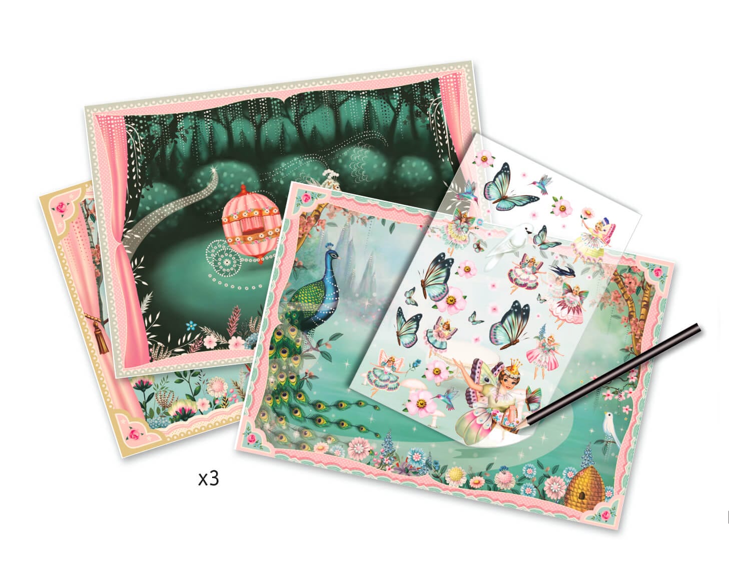 Deze stickerset bestaat uit 3 mooie droomplaten en 90 plaatjes. De plaatsjes plak je er niet op, nee, deze kras je erop door met een potlood over de achterkant van het plaatje te krassen komt het plaatje los en bevestigt deze zich op je droomplaat.