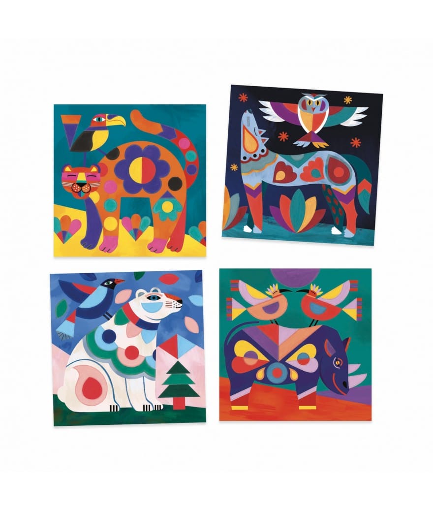 Een boekje met 4 schilderkaarten met papieren paletten en een penseel inbegrepen. De kinderen kiezen de te beschilderen kaart en het bijbehorende palet. Met het bevochtigde penseel werken ze de tekening af door de kleurcode te volgen die op de omtrek van de elementen is aangegeven. Vier tekeningen in heldere, dekkende kleuren!