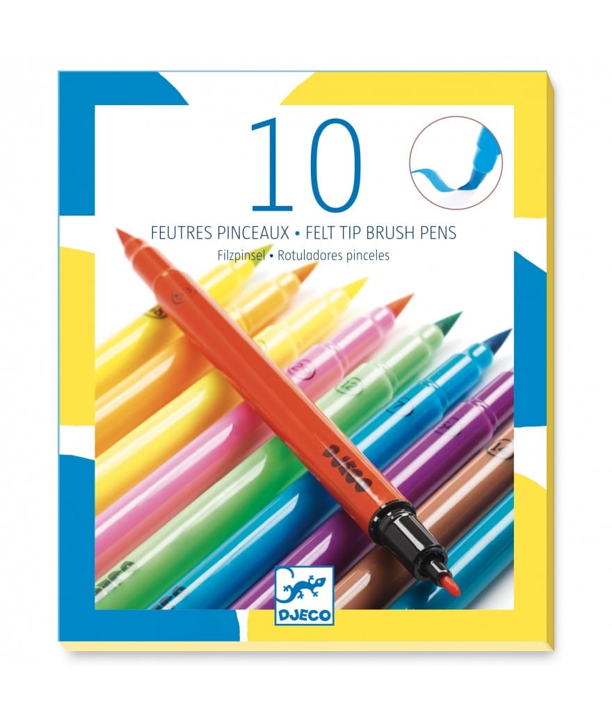 Een doos met 10 twee kantige viltstiften in felle kleuren. Elke viltstift heeft een fijne punt en een penseelpunt om de precisie van de lijn aan te passen. Materiaal van hoge kwaliteit om in alle vrijheid de mooiste kunstwerken te maken.