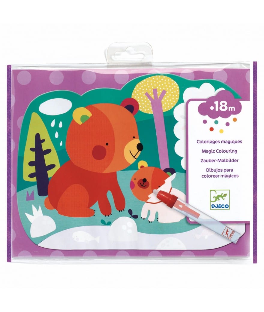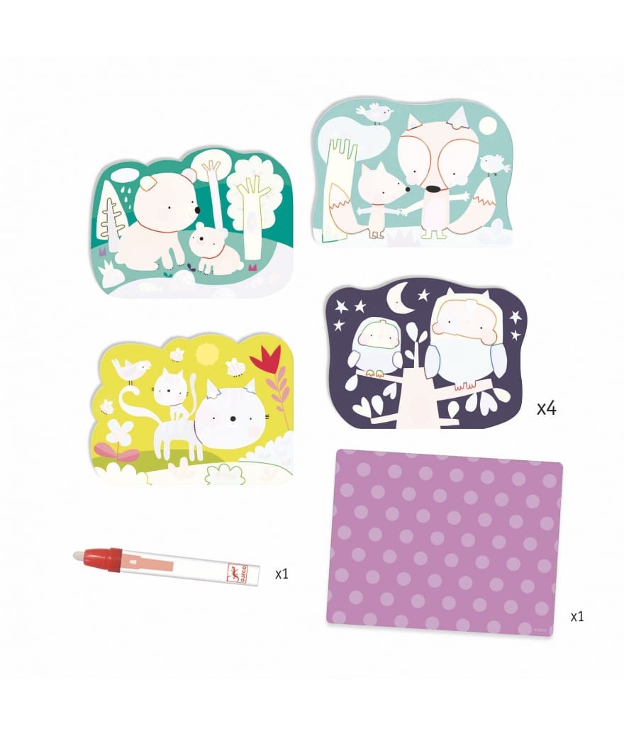 Dit zijn magische kleurplaten van Djeco. Je kleurt de tekeningen in met water en er ontstaan vanzelf afbeeldingen. Is alles ingekleurd? Dan kun je de tekeningen weer laten opdrogen en weer opnieuw ‘inkleuren’. Een ideale tekenset voor de beginnende kunstenaars!