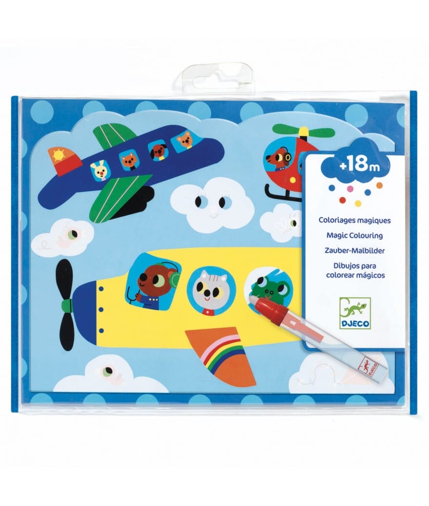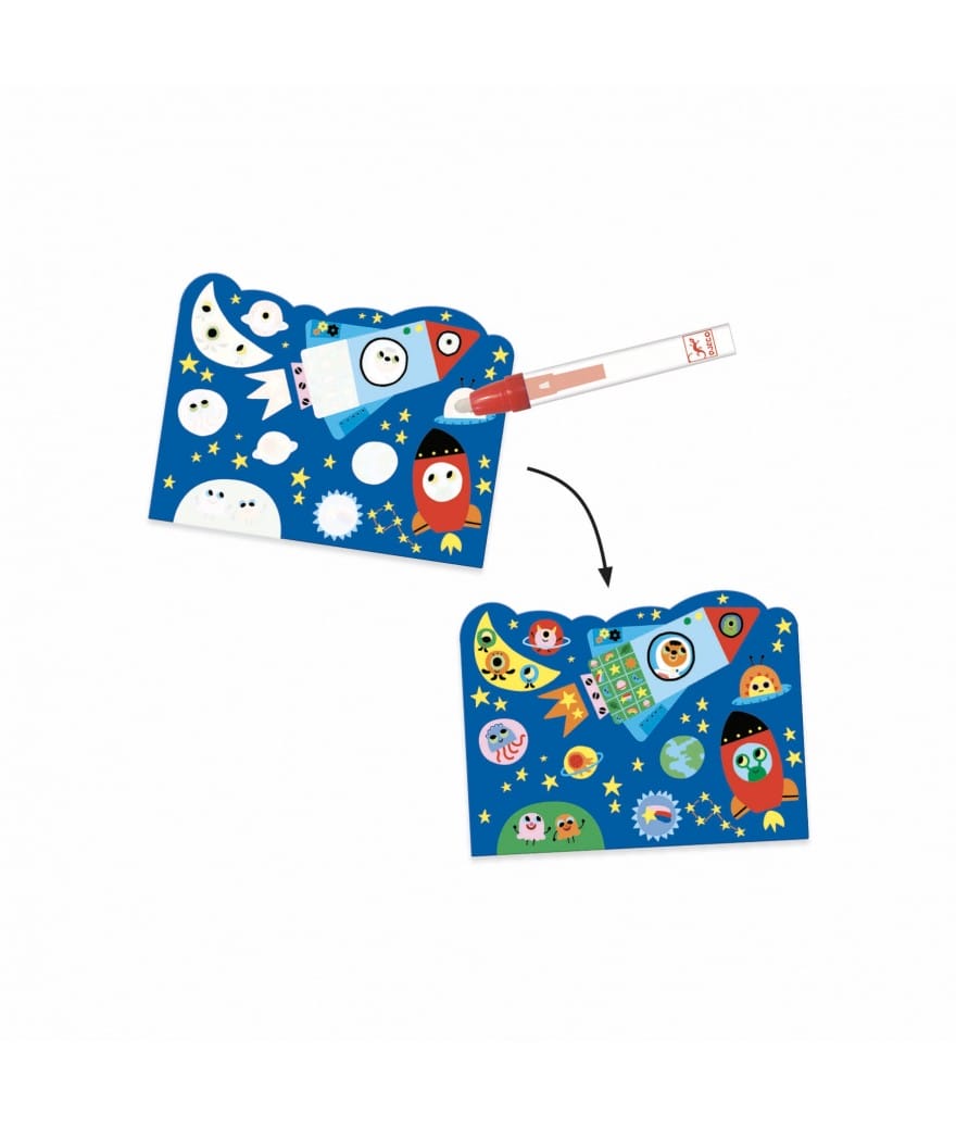 Dit zijn magische kleurplaten van Djeco. Je kleurt de tekeningen in met water en er ontstaan vanzelf afbeeldingen. Is alles ingekleurd? Dan kun je de tekeningen weer laten opdrogen en weer opnieuw ‘inkleuren’. Een ideale tekenset voor de beginnende kunstenaars!