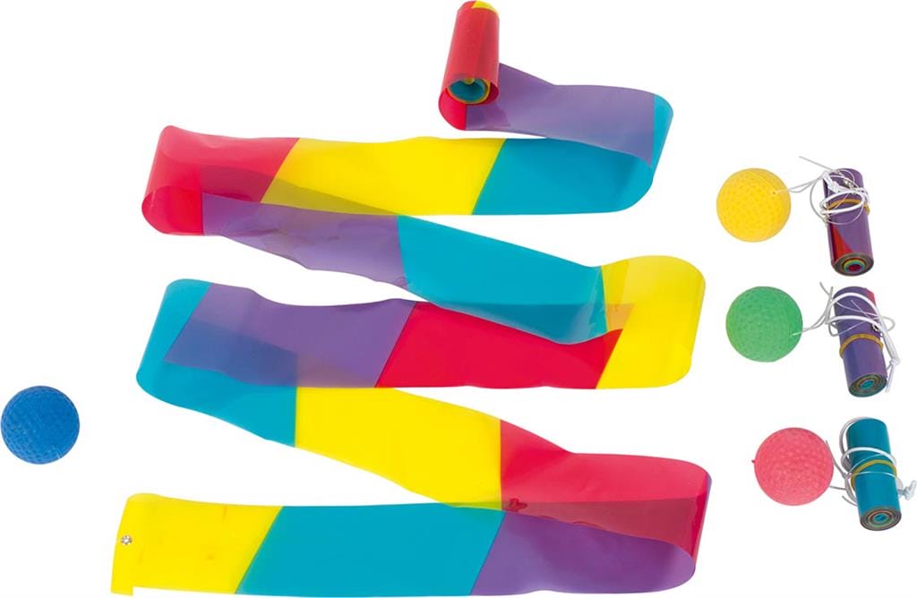 Deze bal met komeetlint kan je gooien alsook gebruiken als gymnastieklint.