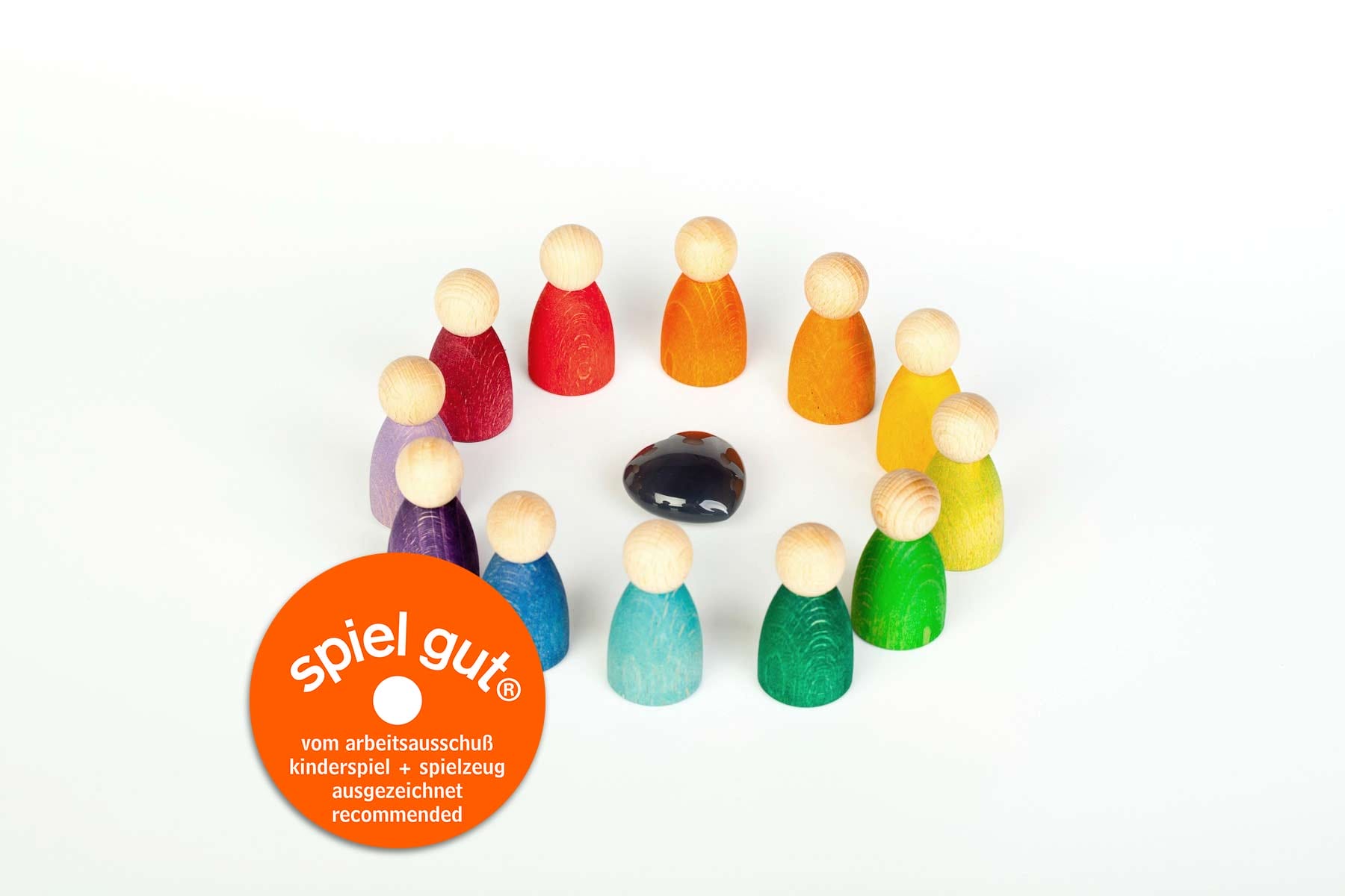 Deze prachtige poppetjes set van Grapat bevat 12 houten poppetjes in de kleuren van de regenboog. De set wordt geleverd in een linnen tas. De poppetjes hebben geen ogen of gezichtsuitdrukking waardoor je, je eigen fantasie erin kan leggen en ze bij elk spel mee kunnen doen. Combineert fantastisch met het mooie speelgoed van Grimms.