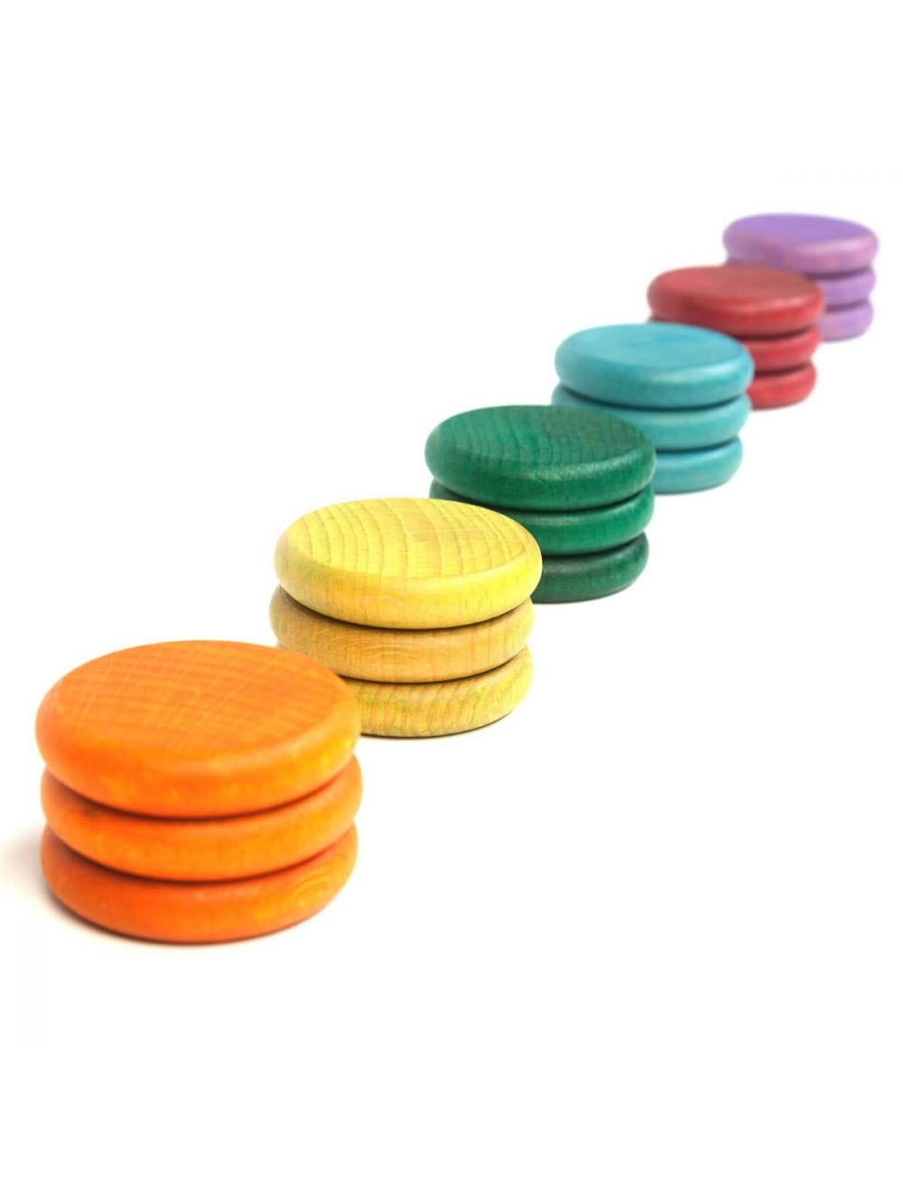 In deze mooie Grapat coins/munten set zitten 18 gekleurde handgemaakte houten munten in verschillende kleuren. Ideaal voor open ended play, of in combinatie met de mandala sets van Grapat.