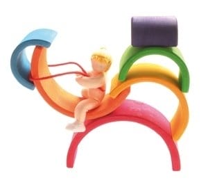 De met de hand gemaakte regenboog van Grimms is veel meer dan alleen maar een regenboog. Het stimuleert het fantasiespel van het kind, want in een handomdraai maak je van deze regenboog een glijbaan, schommel, wegennetwerk of hoge toren. Het geeft het kind ruimte tot ontdekken en eigen vormgeving.Omdat de regenboog met hand wordt gemaakt zijn ze soms niet helemaal symmetrisch.