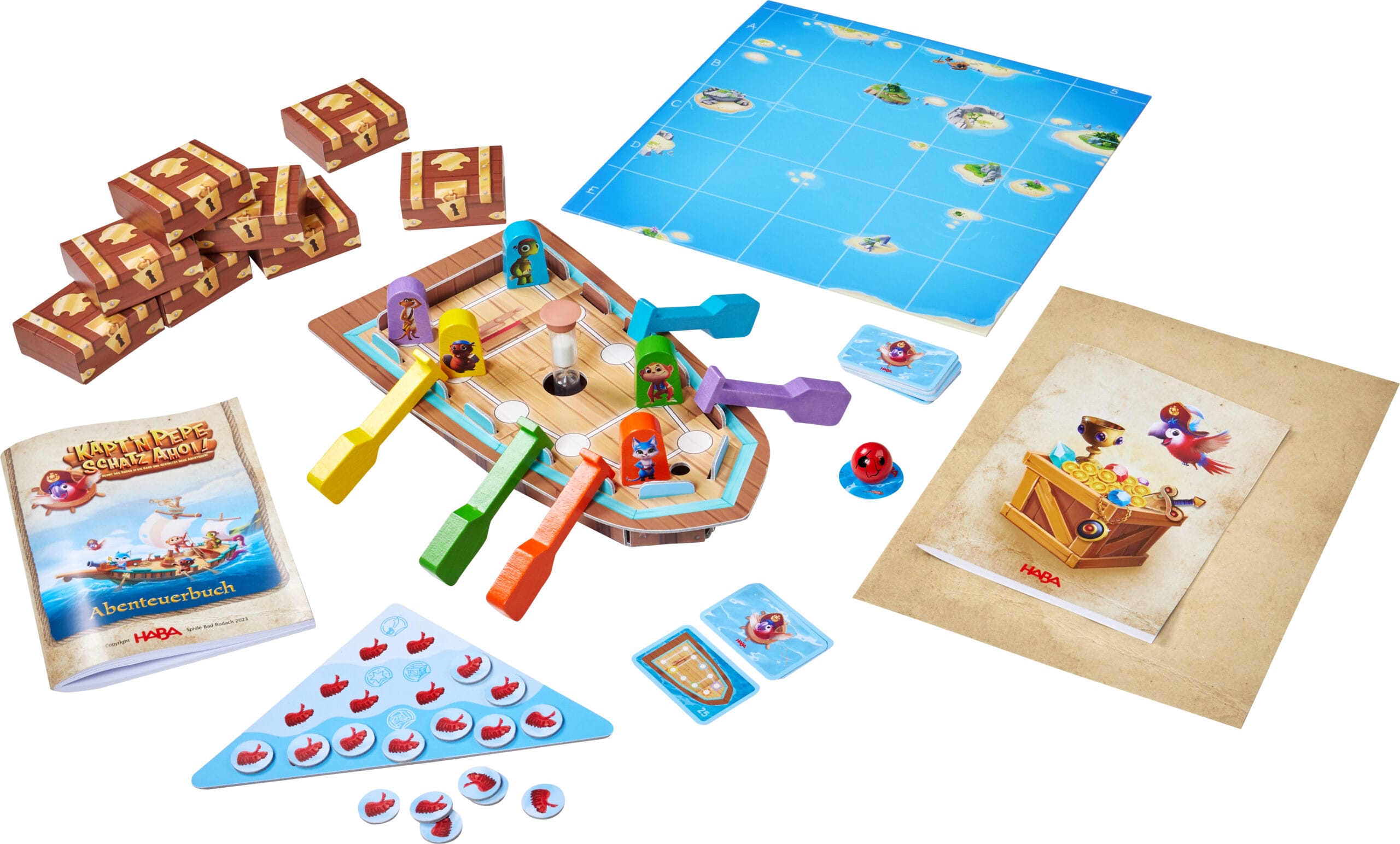 Het spel bestaat uit een kleurrijk speelbord met verschillende eilanden, waarop de spelers hun piratenpionnen kunnen verplaatsen. Het doel is om als eerste de schat te vinden en terug te keren naar het starteiland. Maar pas op voor de gevaren die op de loer liggen, zoals haaien, stormen en andere piraten!