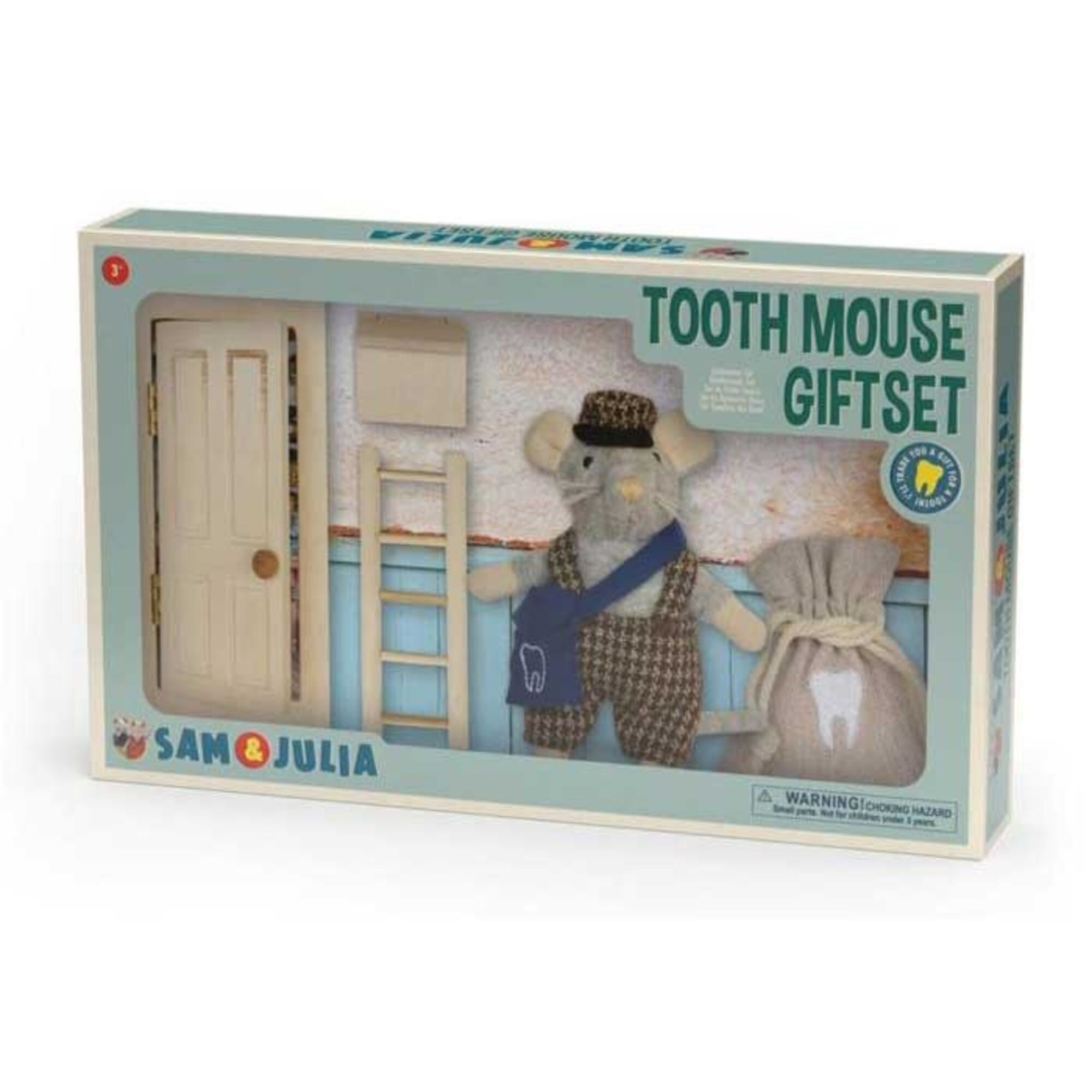 De set bevat een houten deurtje, brievenbus, ladder, decoratie- en stickervellen, een pluchen muis en een herbruikbaar cadeauzakje.