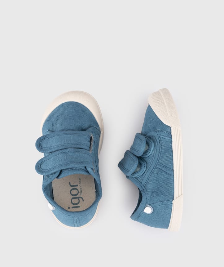 Mooie canvas sneaker met dubbele klittenband sluiting van Igor. Deze schoen is gemaakt vanuit het barefoot concept dus een flexibele en zachte zool en met een uitneembare binnenzool. Je kan ze wassen op 30 graden, haal dan wel eerst de binnenzool er uit.