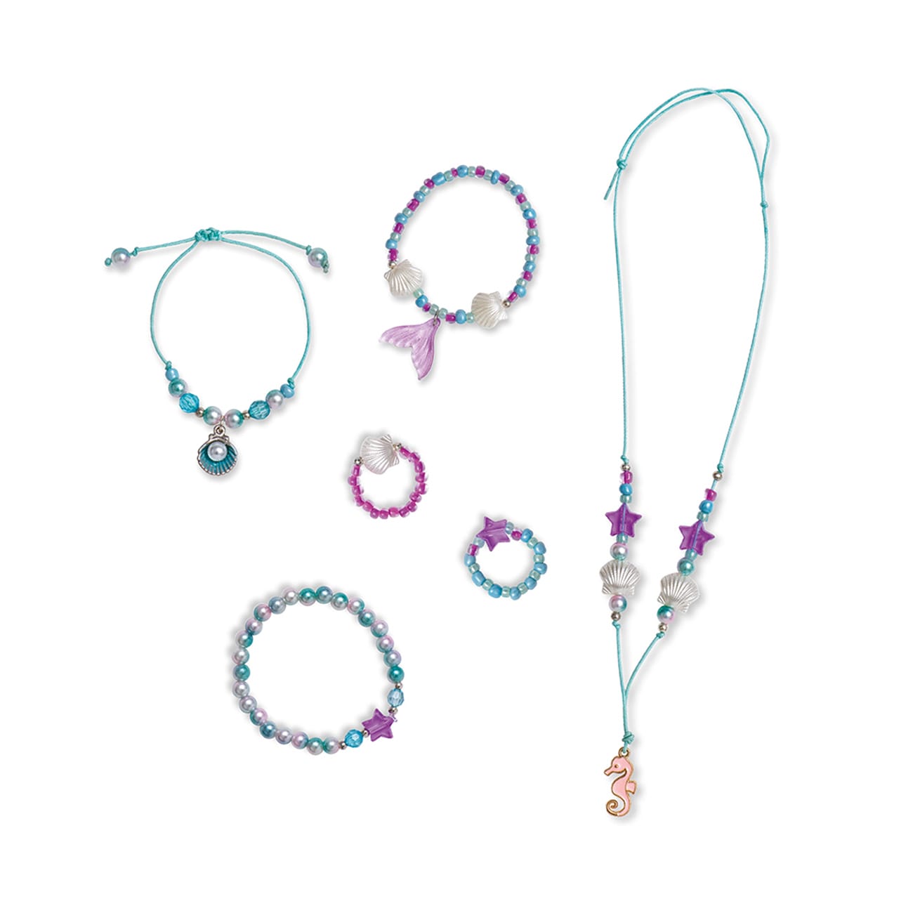 Maak sprookjessieraden en betreed de wereld van zeemeerminnen! Deze set bestaat uit 105 rocaille kralen (blauw, groen en paars), 34 iriserende kralen, 15 zilveren kralen, 5 iriserende schelpkralen, 4 facetkralen, 4 sterrenkralen, 3 bedeltjes (zeepaardje, schelp en zeemeerminnenstaart, 1 blauwe nylon draad, 1 elastische draad en 1 gids met instructies en modellen. Deze zeer uitgebreide inhoud maakt het mogelijk om 6 sieraden, waarvan 2 ringen, 3 armbanden en 1 halsketting te maken.