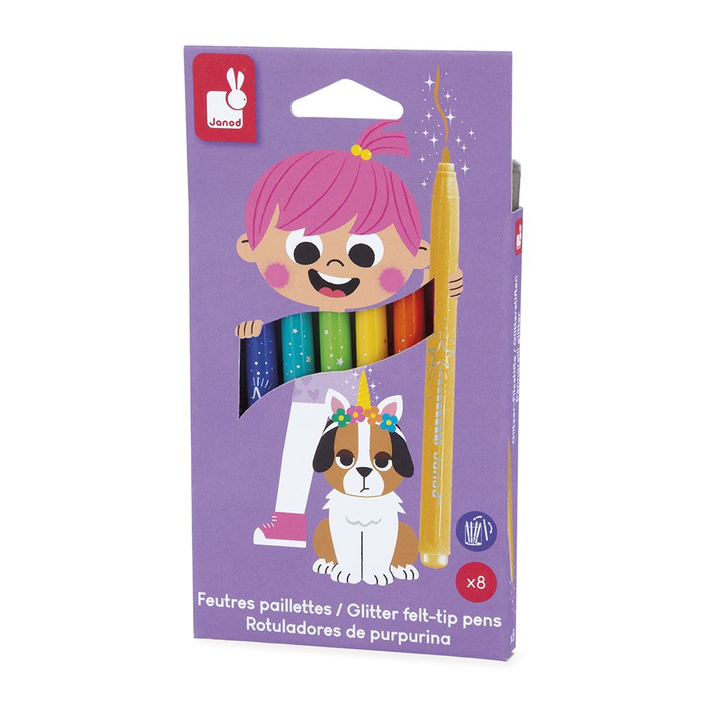 Voeg een vleugje glinsterende magie toe aan de creaties met de glitterstiften! Deze set van 8 stiften biedt een palet van levendige kleuren, perfect voor sprankelende tekeningen. De inkt is gemakkelijk afwasbaar. De kartonnen doos met glittereffect voegt een betoverend element toe bij elk gebruik.