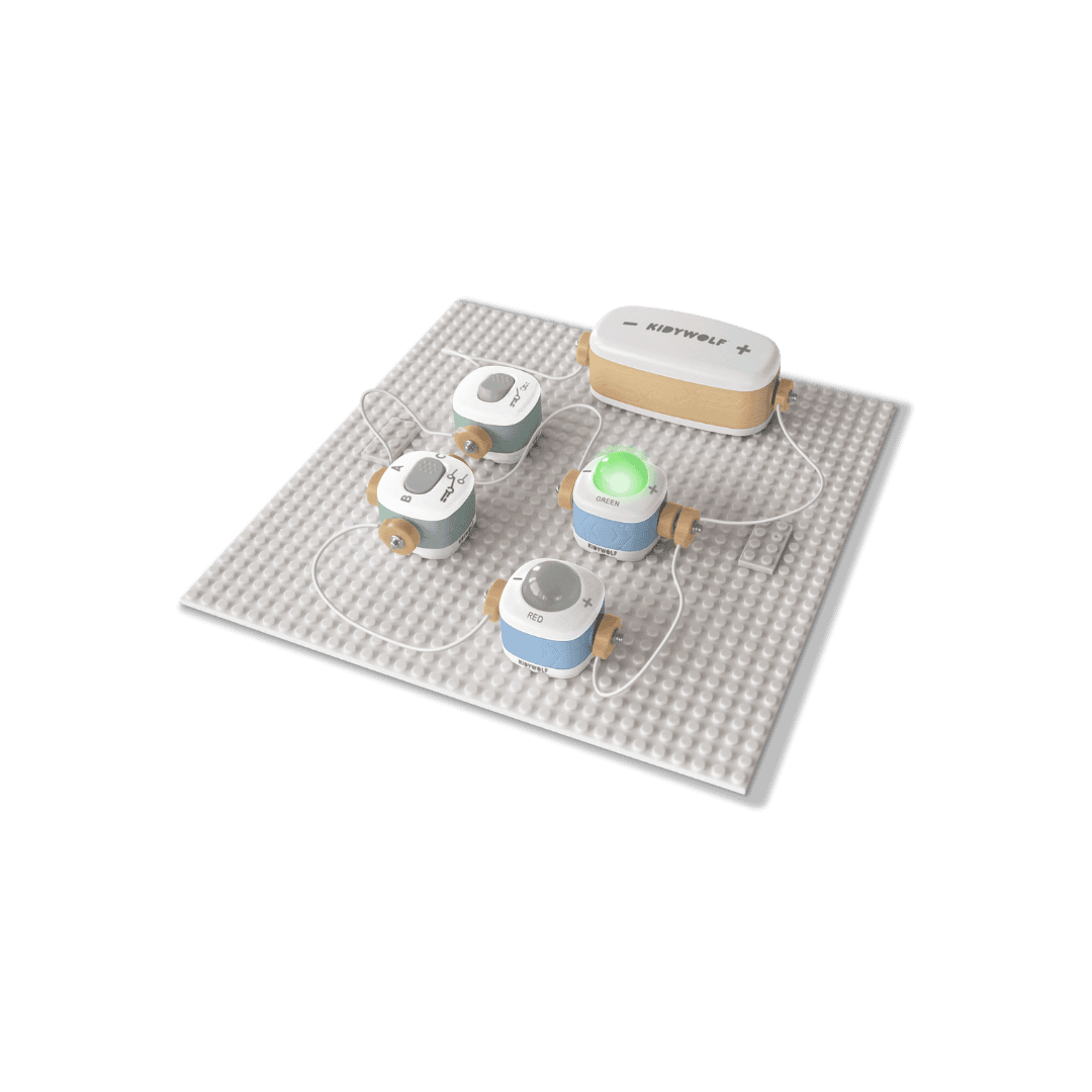 KIDYELEC laat kinderen kennismaken met de boeiende wereld van elektriciteit door middel van praktijkervaring. Door de blokken aan te sluiten, ontdekken ze hoe een circuit werkt, testen ze hun ideeën en zien ze het resultaat oplichten… of draaien! Elke geslaagde montage wordt een concrete overwinning, die de zin om te leren en te begrijpen stimuleert. Een leuke en waardevolle activiteit, die natuurlijke nieuwsgierigheid omzet in kennis.
