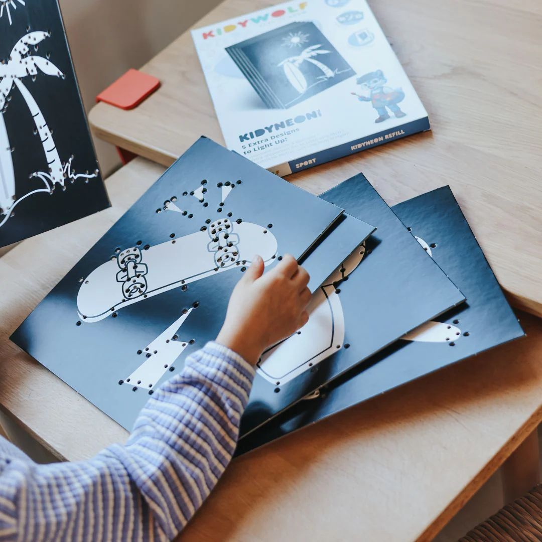 Verleng het creatieve avontuur met de navullingen van KIDYNEON! Een pakket met 5 nieuwe voorgeperforeerde borden met verschillende tekeningen. Ideaal om plezier te blijven hebben, de creativiteit te stimuleren en steeds weer nieuwe kunstwerken te maken!