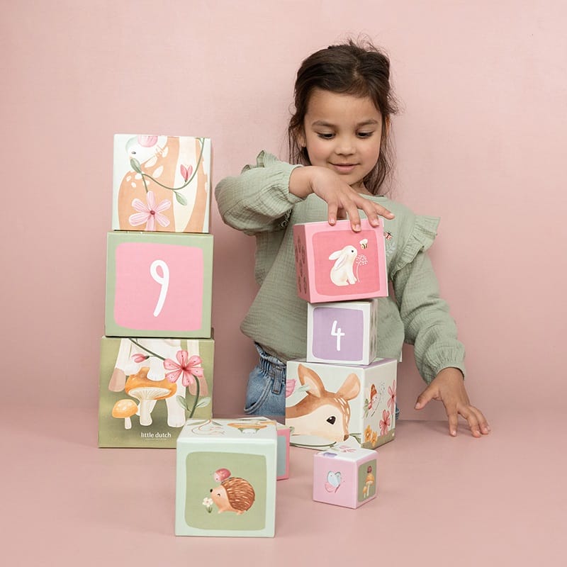 Stapel het ene blok op het andere en zie de magie van Fairy Garden groeien! Je kunt de blokken op elkaar stapelen om een hoge toren te maken of ze horizontaal op de grond leggen. Ontdek vier betoverende taferelen terwijl je bouwt. Creëer een weelderige bloementak die wordt bewoond door de mooiste boswezens. Sorteer ze op twee manieren door te tellen, of verzamel alle afbeeldingen uit de magische tuin. Kinderen leren spelenderwijs tot 10 te tellen met deze stapelblokken. De blokken zijn voorzien van prachtige illustraties uit de Fairy Garden-collectie, waaronder herten, konijntjes, egels, feeën, lieveheersbeestjes en vrolijke bloemen. Om ze gemakkelijk op te bergen, passen de kleine blokjes in de grotere. Gemaakt van stevig karton, kunnen de blokken tegen een stootje. Het kleinste blokje meet 5 cm en de grootste is 14 cm.