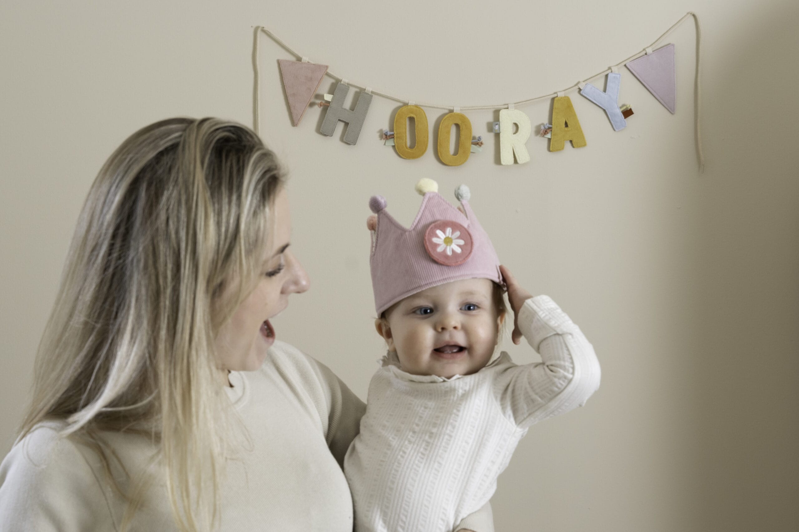 Hiep hiep hoera! Vier je verjaardag in stijl met deze schattige verjaardagskroon en strooi wat sprookjesachtige magie over jouw speciale dag. Verwissel ieder jaar het cijfer van 1 tot en met 5 zodat de kroon meegroeit met elke mijlpaal van jouw kleintje. Kies het verjaardagsnummer, zet de kroon op en leg die kostbare momenten vast! Of kies voor het embleem met de bloem wanneer jouw kleintje elke dag wel de koning of koningin van wonderland wil zijn. De kroon is gemaakt van zacht gevoerde en geribbelde stof in lichtroze, afgewerkt met gekleurde pompons. Dankzij de klittenbandsluiting groeit de kroon mee met jouw kindje. Kijk hoe trots jouw kleintje de kroon draagt en zijn of haar leeftijd toont met elke glimlach en giechel. Fijne verjaardag!