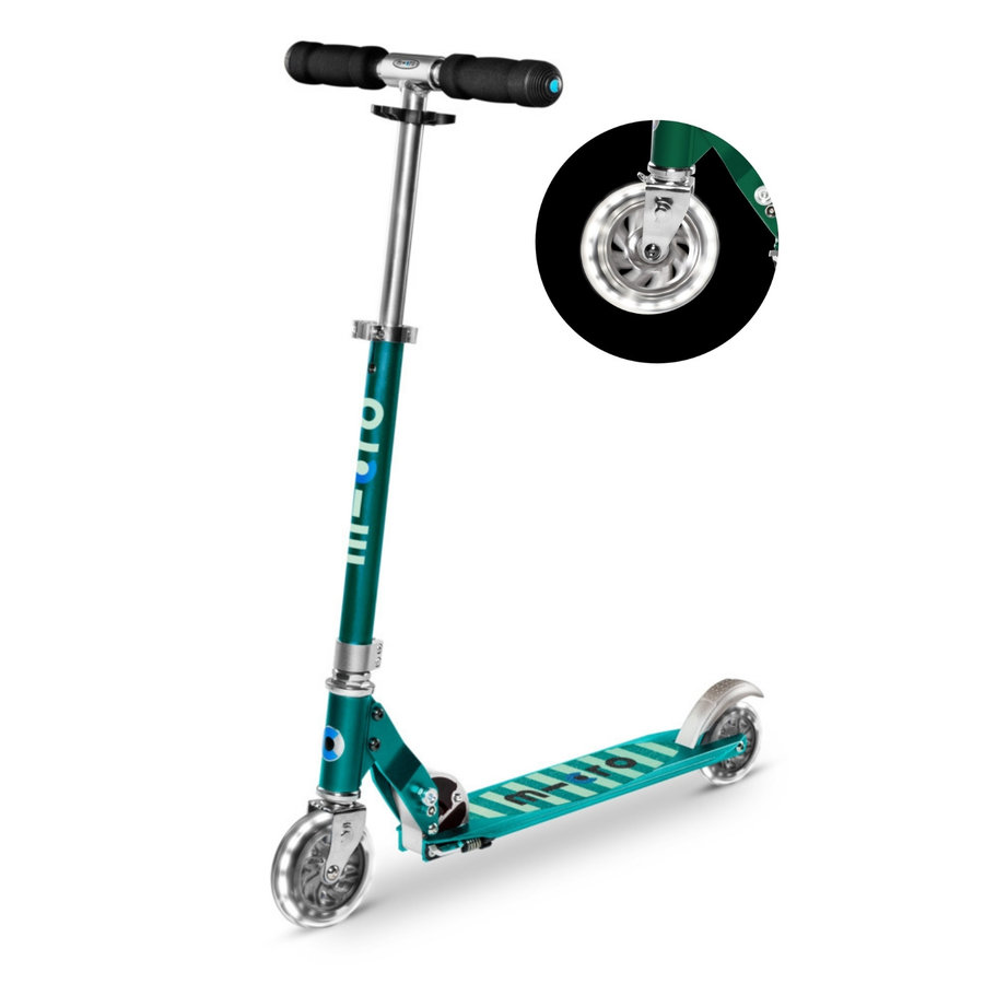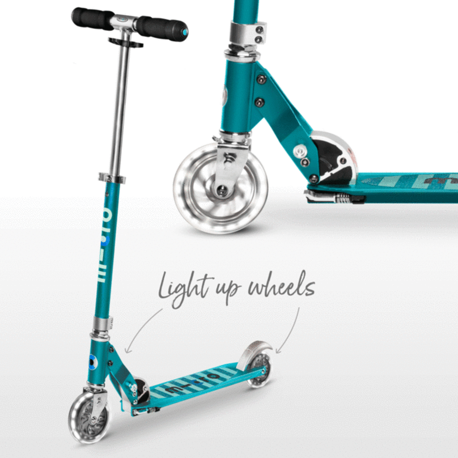 Mooie twee wiel step met lED verlichting in de wielen. De slimme LED-technologie gebruikt inductie-energie om de kracht die kinderen creëren terwijl ze steppen. Geen batterijen. Geen gedoe. De wielen lichten wit op, om de donkerste avonden te verlichten en de meest gewone dagen op te fleuren. Kinderen vinden het geweldig. De Sprite stuurt als een fiets en rijdt nagenoeg geruisloos. Of het nu gaat om het opbouwen van snelheid of het nemen van obstakels, kinderen kunnen het gemakkelijk doen dankzij het slimme Zwitserse ontwerp van de Sprite.