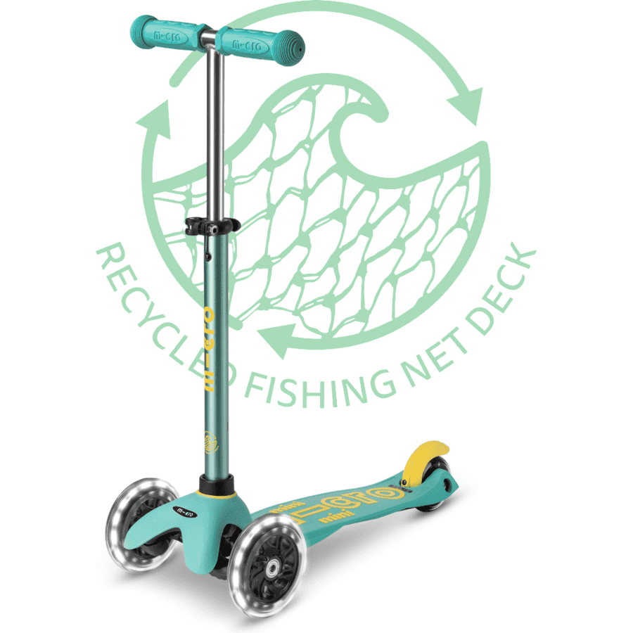 Ongeveer 10 procent van het plastic afval in de oceanen is afkomstig van de visserij. Jaarlijks blijft naar schatting 640.000 ton netten en ander materiaal in de wateren achter. Van een deel van dit afval, dat op stortplaatsen wordt ingezameld, maken we onze duurzame kindersteppen. De voetplaat en rem van de Mini Micro Deluxe ECO zijn gemaakt van gerecyclede visnetten en ander plastic afval. Daarnaast heeft het product dezelfde eigenschappen als de populaire Mini Micro Deluxe.