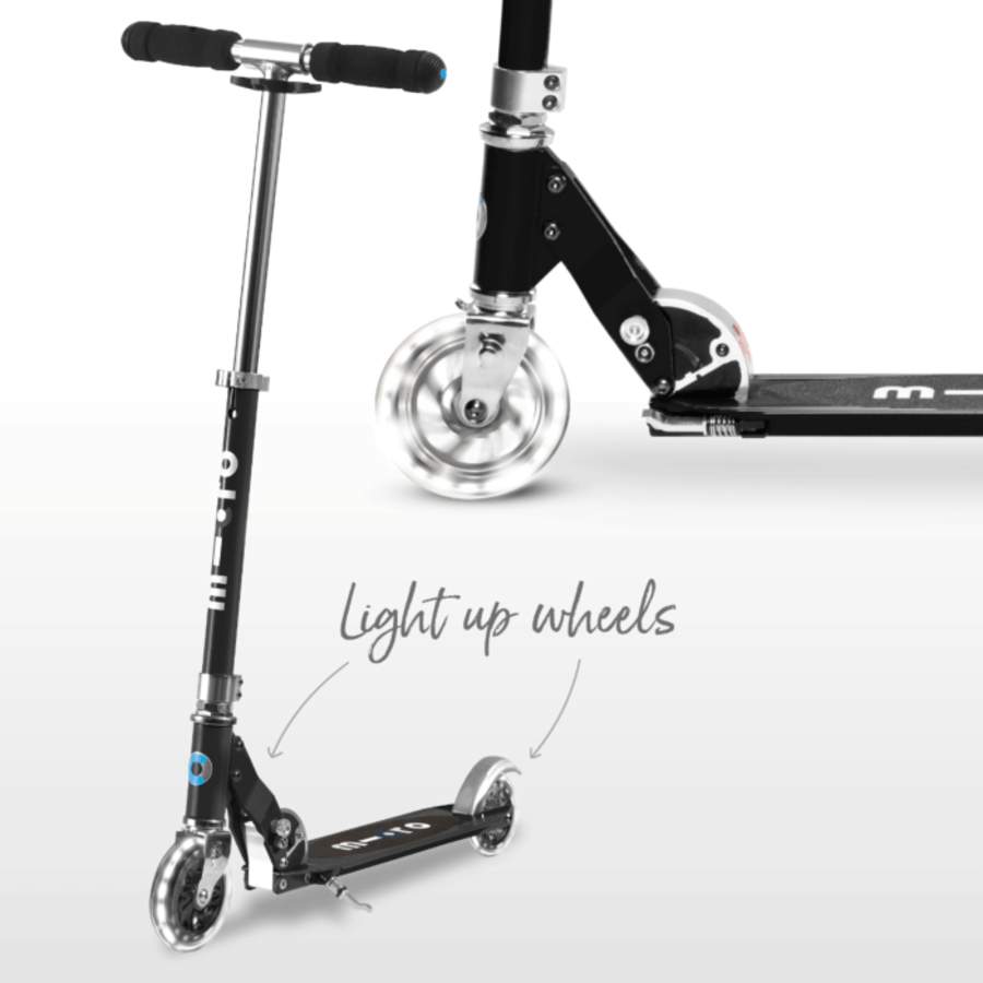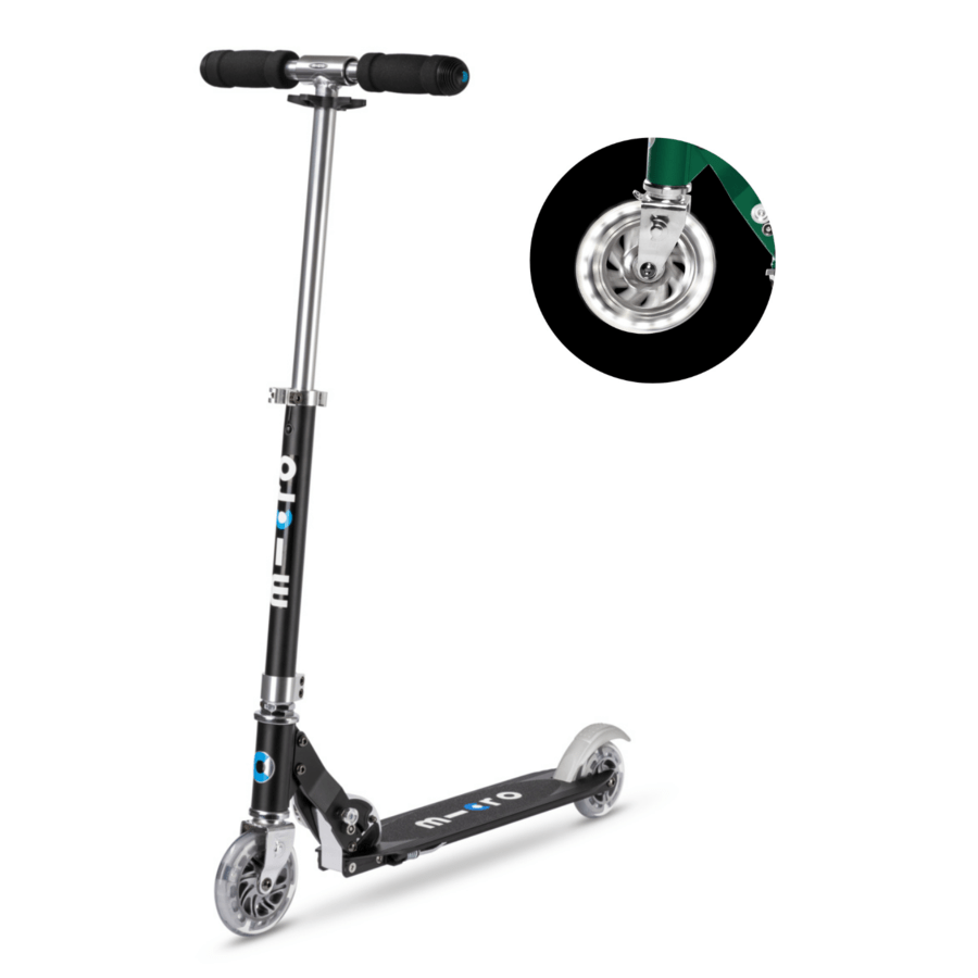 Mooie twee wiel step met LED verlichting in de wielen. De slimme LED-technologie gebruikt inductie-energie om de kracht die kinderen creëren terwijl ze steppen. Geen batterijen. Geen gedoe. De wielen lichten wit op, om de donkerste avonden te verlichten en de meest gewone dagen op te fleuren. Kinderen vinden het geweldig. De Sprite stuurt als een fiets en rijdt nagenoeg geruisloos. Of het nu gaat om het opbouwen van snelheid of het nemen van obstakels, kinderen kunnen het gemakkelijk doen dankzij het slimme Zwitserse ontwerp van de Sprite.