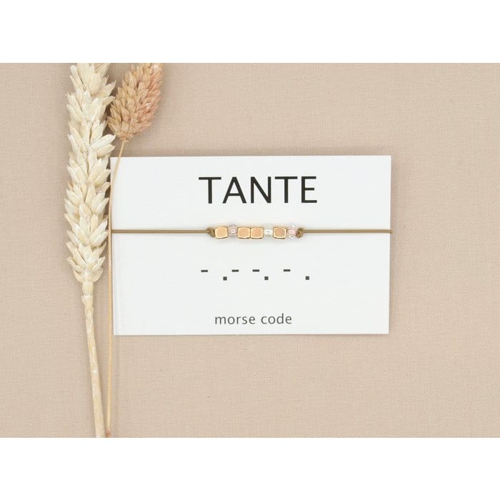 Een morse code armbandje met de tekst tante. Gemaakt van elastiek en een verstelbare sluiting waardoor hij om (bijna) elke pols past.