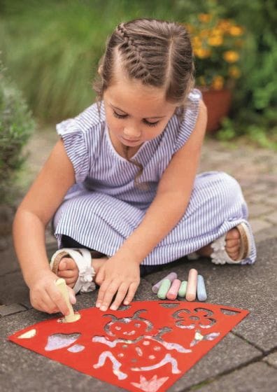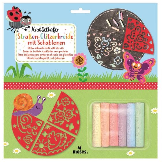 Zes verschillende kleuren glitter stoepkrijt plus 4 sjablonen ( van 29 x 29 cm) om de mooiste kunstwerkjes op de stoep te maken.